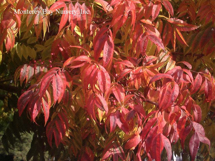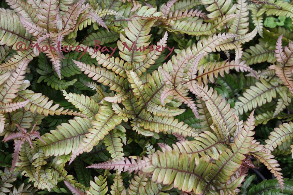 ‘Flame’  foliage  sometimes listed as a separate species,  P. tricolor, this evergreen fern is easily distinguished by broad, very glossy triangular fronds divided into long, finger-like sections. The foliage emerges brilliant red, ages to copper or bronze, finally becoming dark green. The stems are dark mahogany. This is a rather durable landscape variety that is deciduous below 25°F. Mostly shade, regular watering, great in containers. ProbablyUSDA zone 9/Sunset zones 9, 16-17, 21-24. rev 1/2013