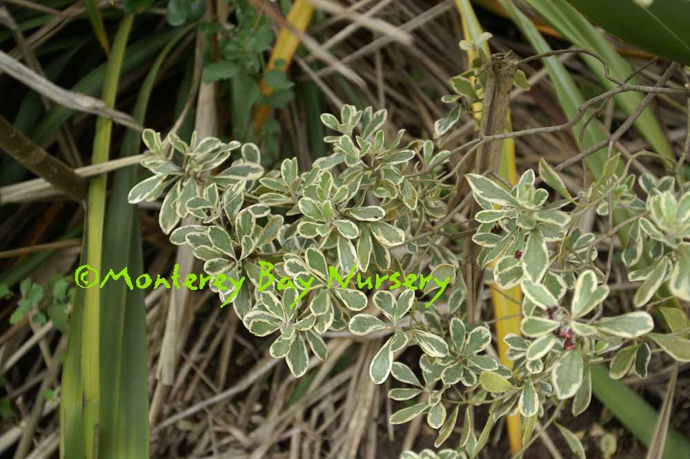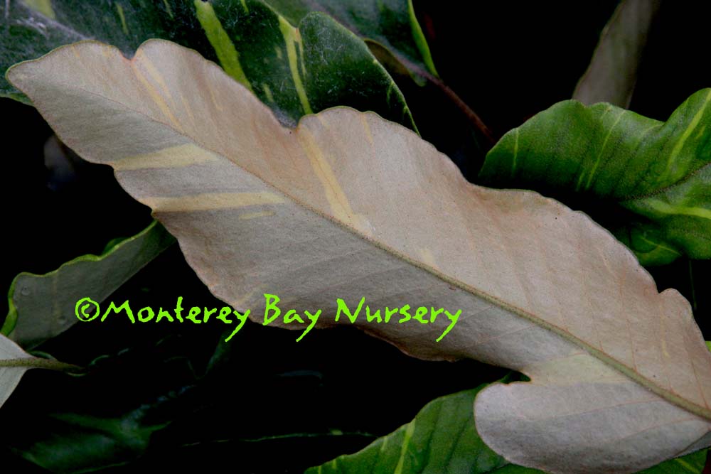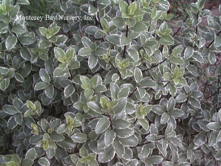‘Garnet’ (not currently in production)  foliage detail  an old famous variegated form. Rounded grey green leaves are edged in ivory white, with rosy tints developing in cool weather. Twigs are a contrasting purple black. A slower, more compact grower to about 10'. Sunset zone 5/USDA zone 8b. rev 2/2021