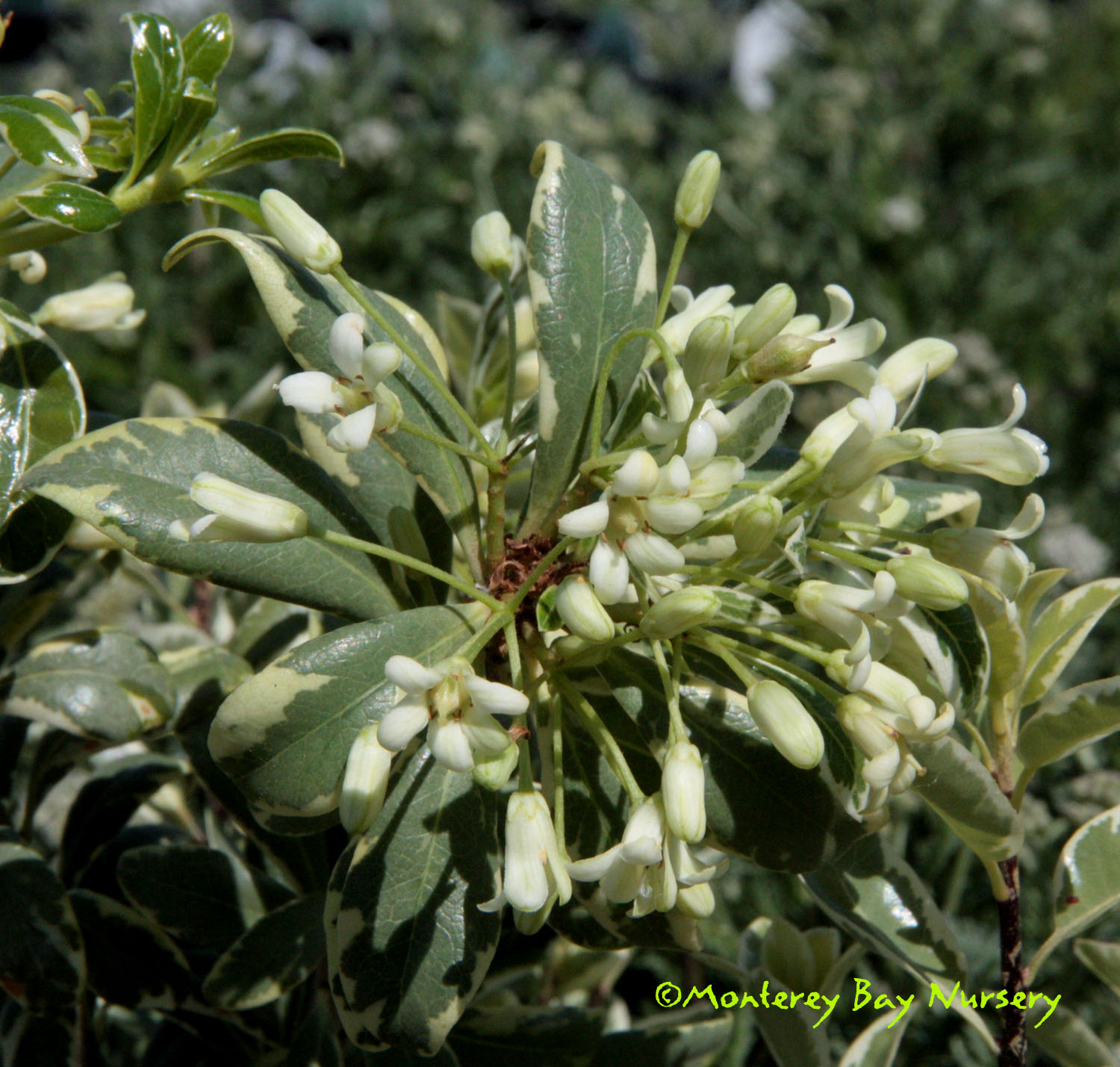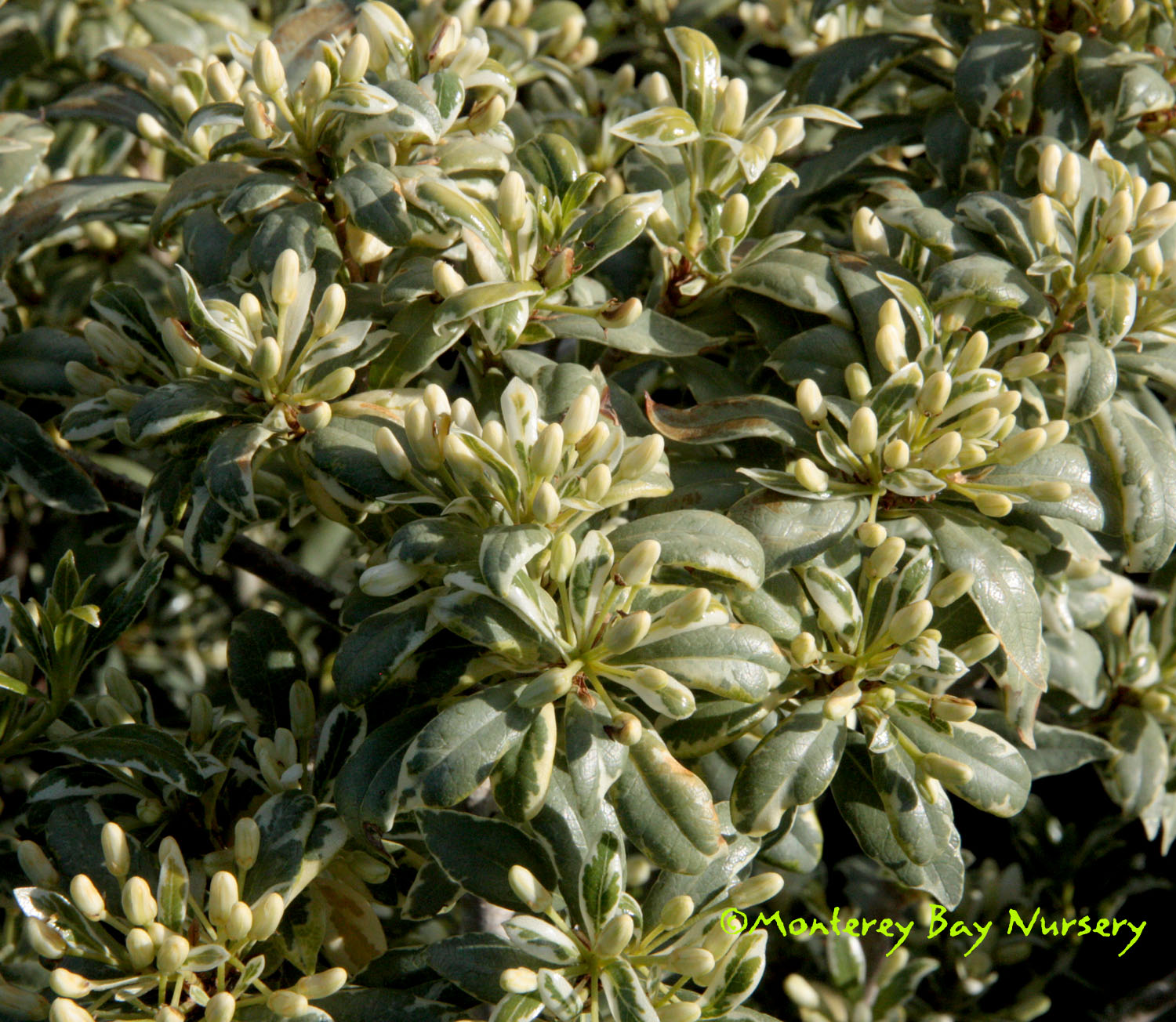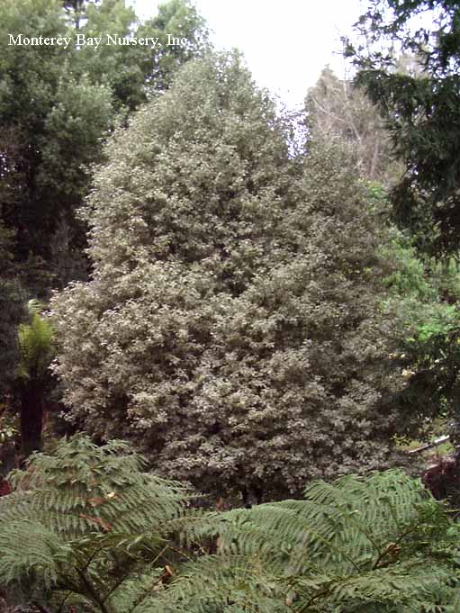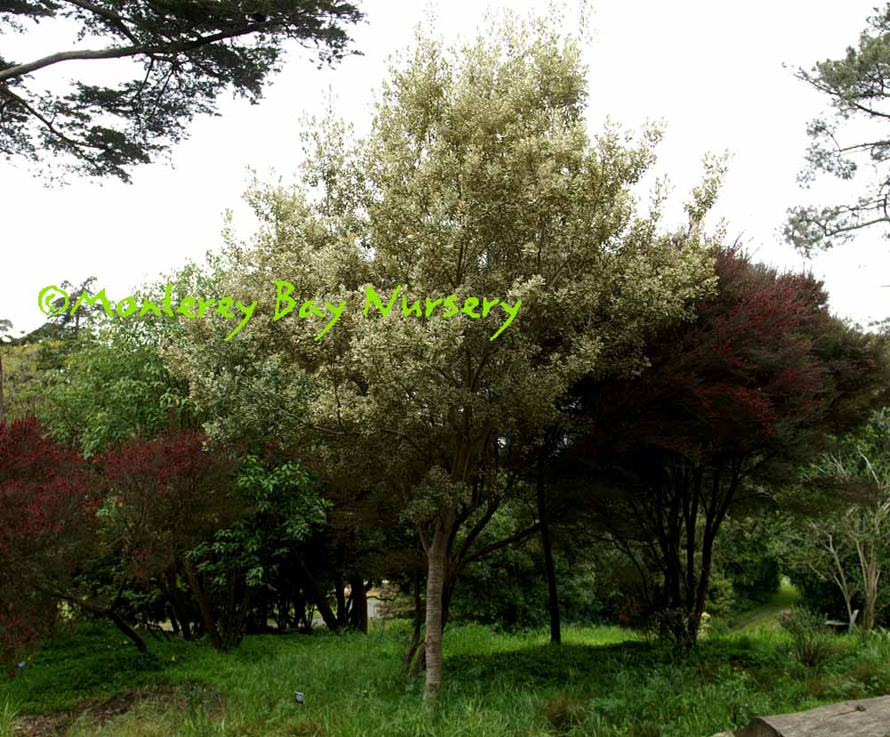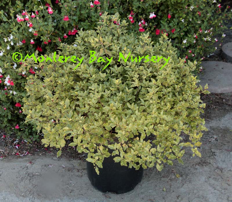 'Silver Magic'  foliage  a variegated form of 'Silver Sheen,' with small, shiny round leaves edged in creamy white. Slightly slower growth and slightly smaller ultimate height, but ultimately to at least 15-20' and of course much lower with shearing or pruning. rev 7/2009