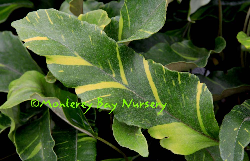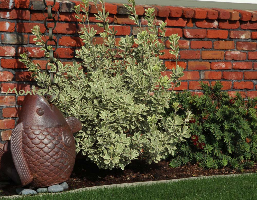 ‘Marjorie Channon’  foliage closeup  hedge  natural, unclipped shape  globe   to 6-8’ tall, eventually taller, with leaves edged creamy white. This is truly an elegant, formal foliage plant that is relaxed enough to find use in most foliage gardens as well. It looks great reaching through a wrought iron or dark picket fence. Its variegated foliage naturally limits its growth rate, reducing by half or three fourths trimming needs in clipped or space-restrained applications. Along with its mostly broad versus hyper-frantic vertical growth habit (I'm lookin' at YOU, Silver Sheen!) that feature makes it probably the very best variety of all to use as a clipped or occasionally pruned hedge. To Sunset zone 5/USDA zone 8b. rev 8/2021