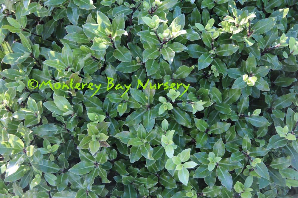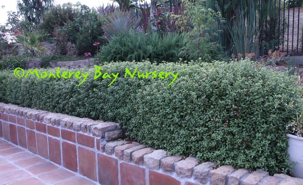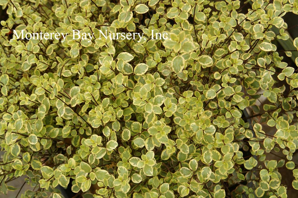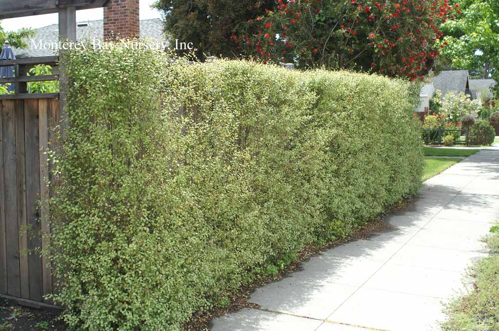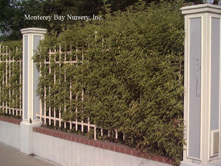 backlit  clipped hedge  tiny, round, glossy, silvery green leaves against black stems, with very fine textured, relatively sparse on the branches and of open growth at first but later filling in to become very dense. In fact I would say this may be the best overall screening variety due to its fast growth, extremely full habit and tendency to quickly fill any holes in its outline. The foliage is highly reflective and quite impressive when lit from an angle. Fast, reaching quite quickly in spite of its demure scale, upright to rounded in shape, forming an almost impenetrable mass of foliage. One planting I know of looks almost like a vertical patch of Muhlenbeckia complexa, Mattress Vine. rev 4/2007