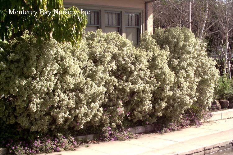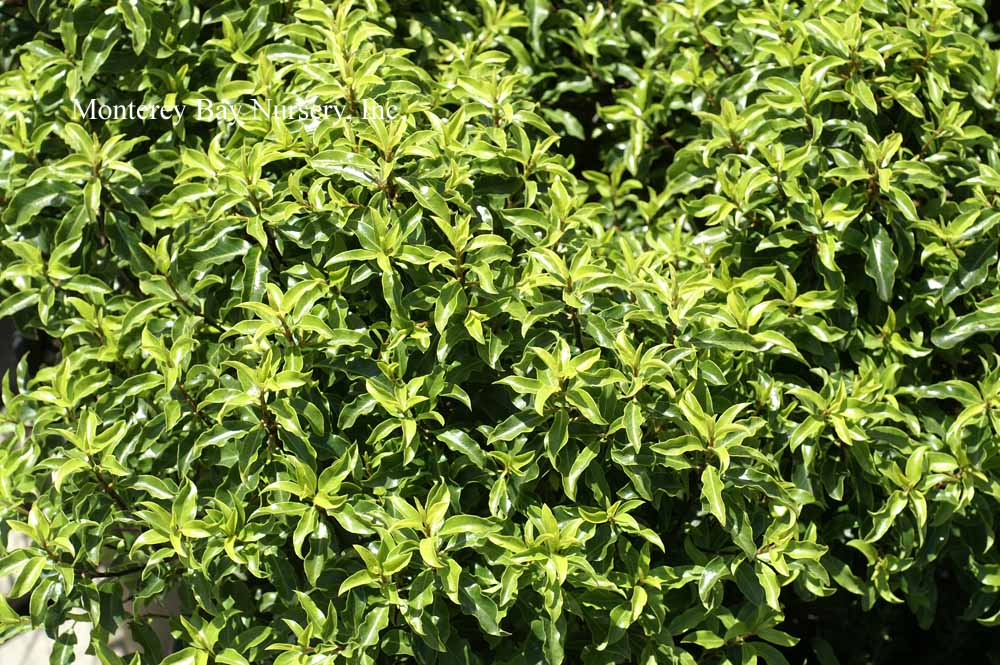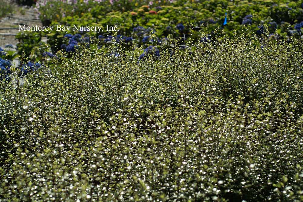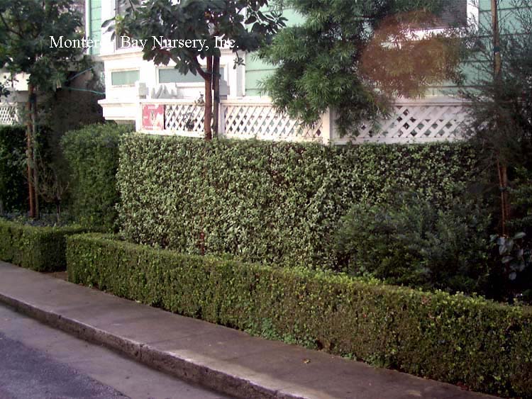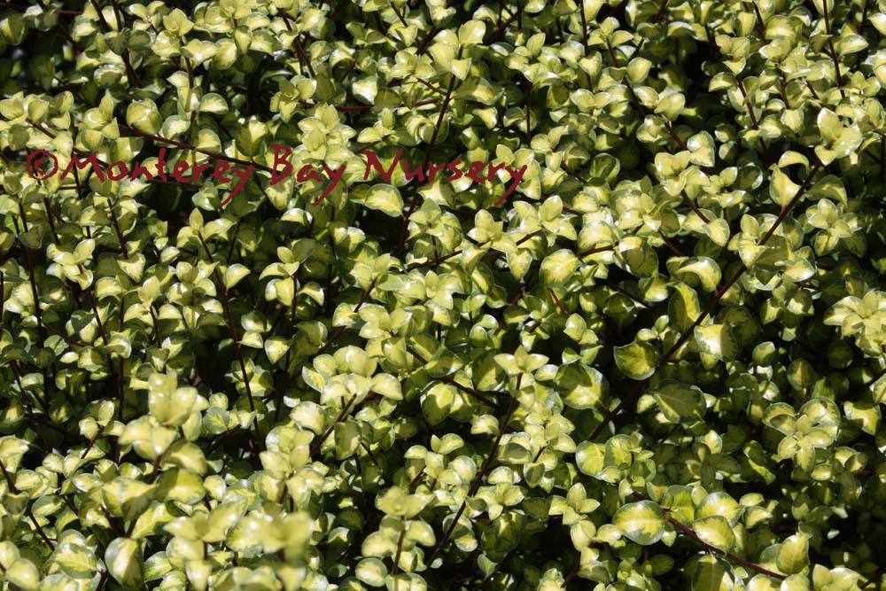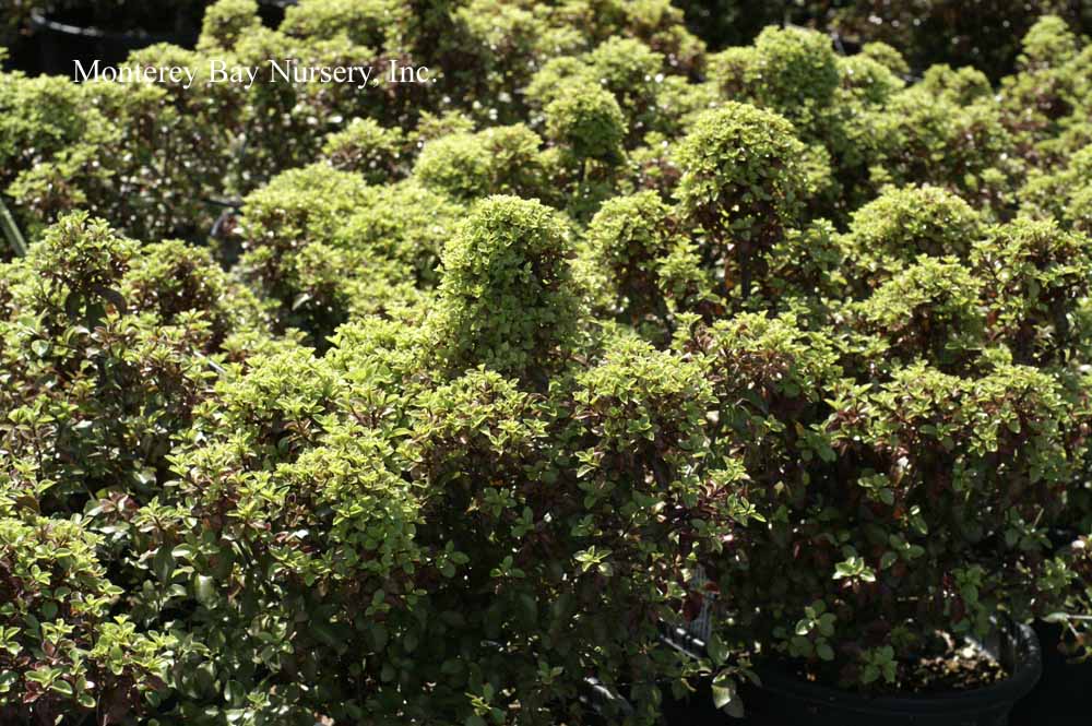 backlit  clipped hedge  tiny, round, glossy, silvery green leaves against black stems, with very fine textured, relatively sparse on the branches and of open growth at first but later filling in to become very dense. In fact I would say this may be the best overall screening variety due to its fast growth, extremely full habit and tendency to quickly fill any holes in its outline. The foliage is highly reflective and quite impressive when lit from an angle. Fast, reaching quite quickly in spite of its demure scale, upright to rounded in shape, forming an almost impenetrable mass of foliage. One planting I know of looks almost like a vertical patch of Muhlenbeckia complexa, Mattress Vine. rev 4/2007