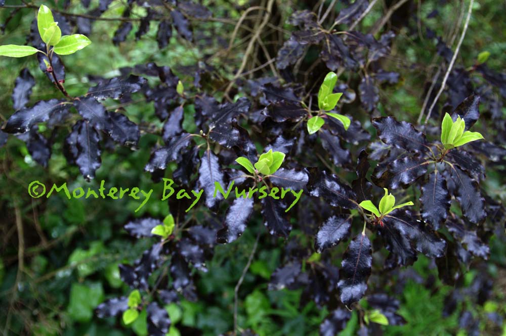 'Ebony Giant'   leaves emerging  same purple-black mature foliage as the familiar dwarf variety 'Tom Thumb,' but on a typical open, standard-sized plant, growing to at least 15' tall or more. I have only seen one relatively young plant, at Strybing Arboretum (the source of our plant, and thanks Don Mahoney!) but clearly this is no dwarf. Use it where you can feature its striking color, like against brighter green plants, or a light stucco wall.  Sunset 8-9, 14-17, 19-24/USDA zone 9. rev 6/2012
