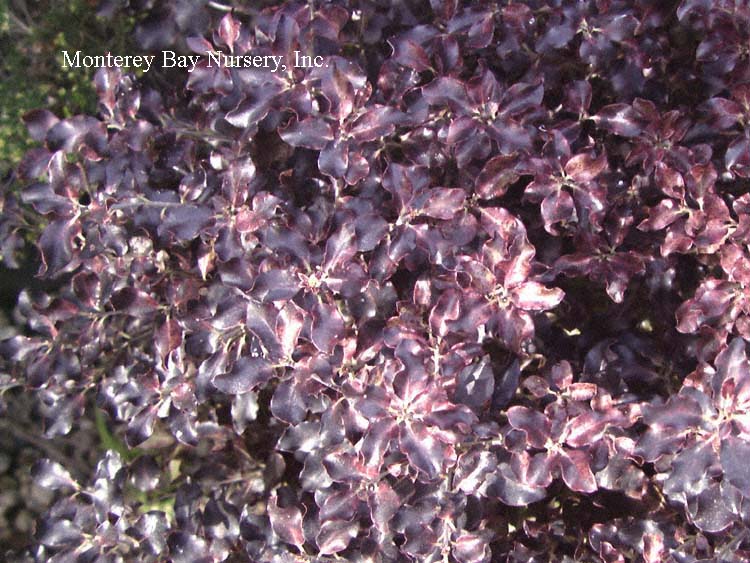 'Tom Thumb'  (not currently in production) foliage closeup  probably ‘Tom Thumb,’ but we lost the label and it doesn't exactly match the description. Compact growth to 4’ tall, 6’ wide with leaves turn dark purple black in late fall, retaining that color until late spring. New growth emerges greener, but even then is still considerably darker than most forms of  P. tenuifolium. To Sunset zone 5/USDA zone 8b. rev 2/2021