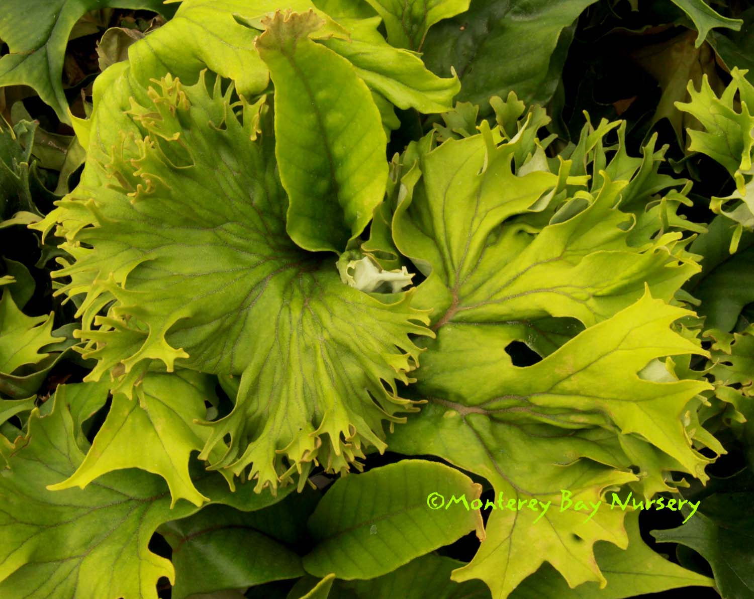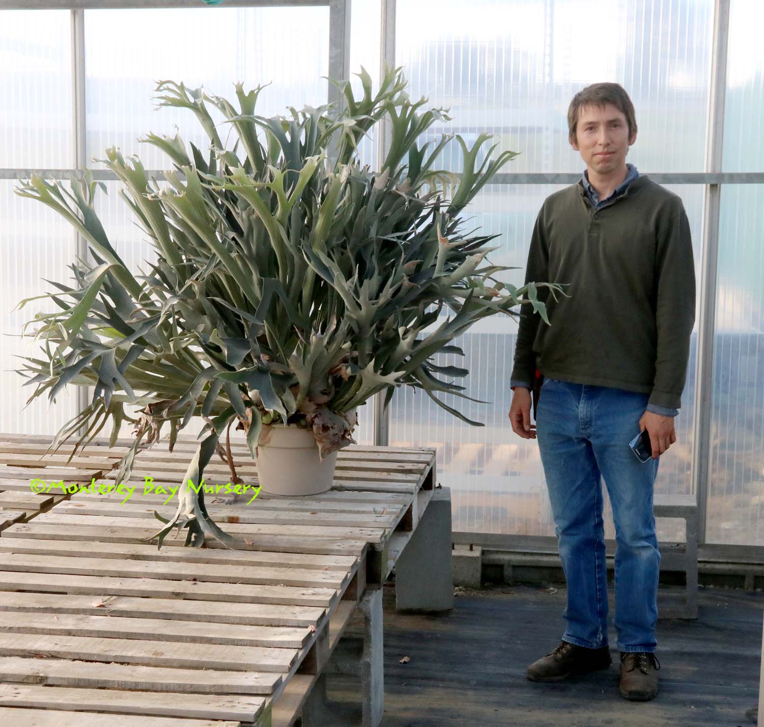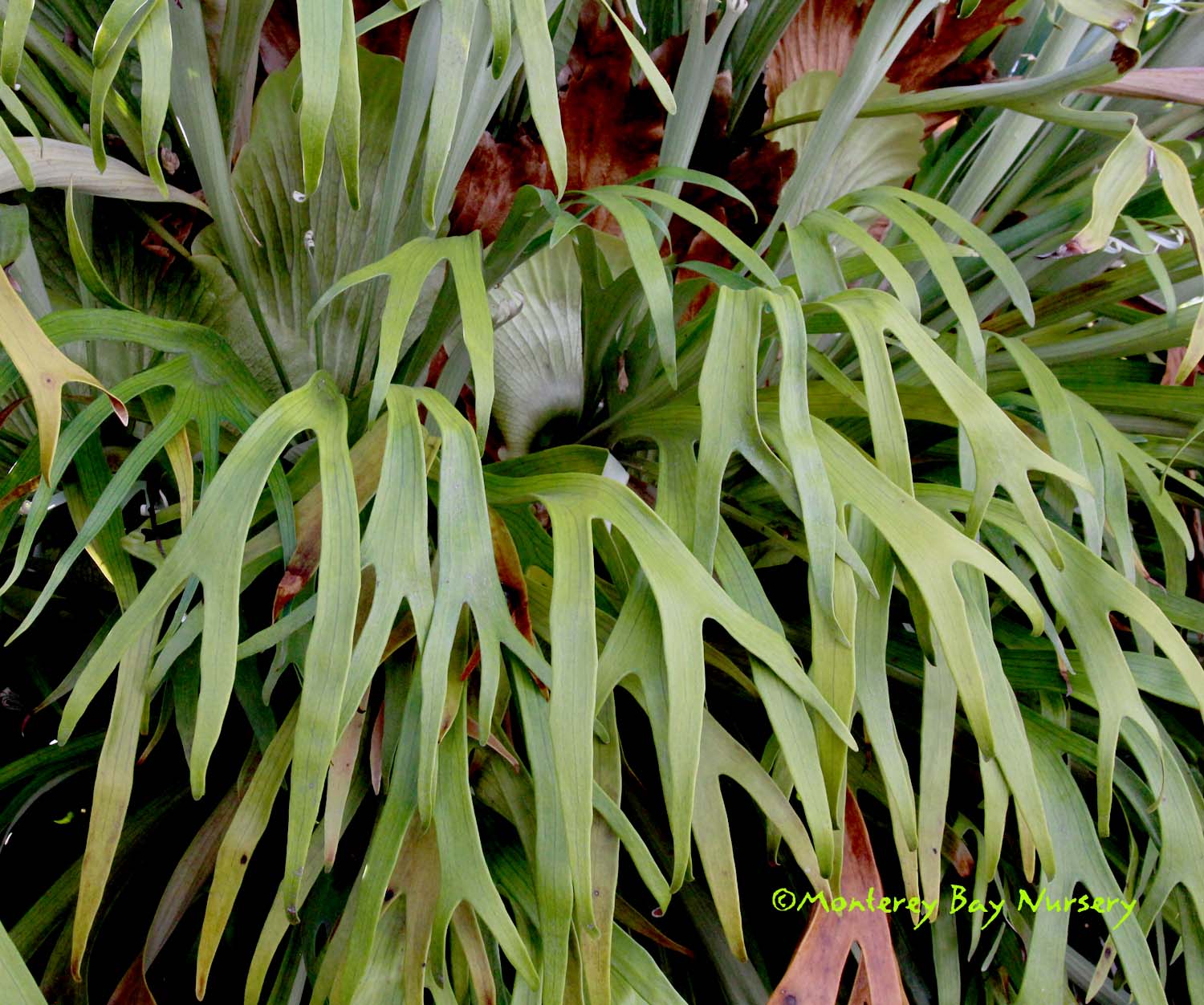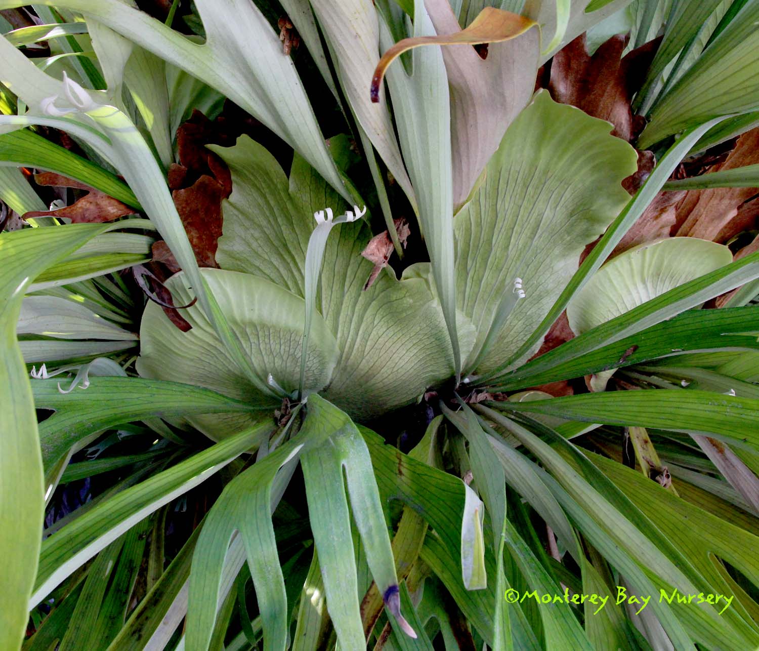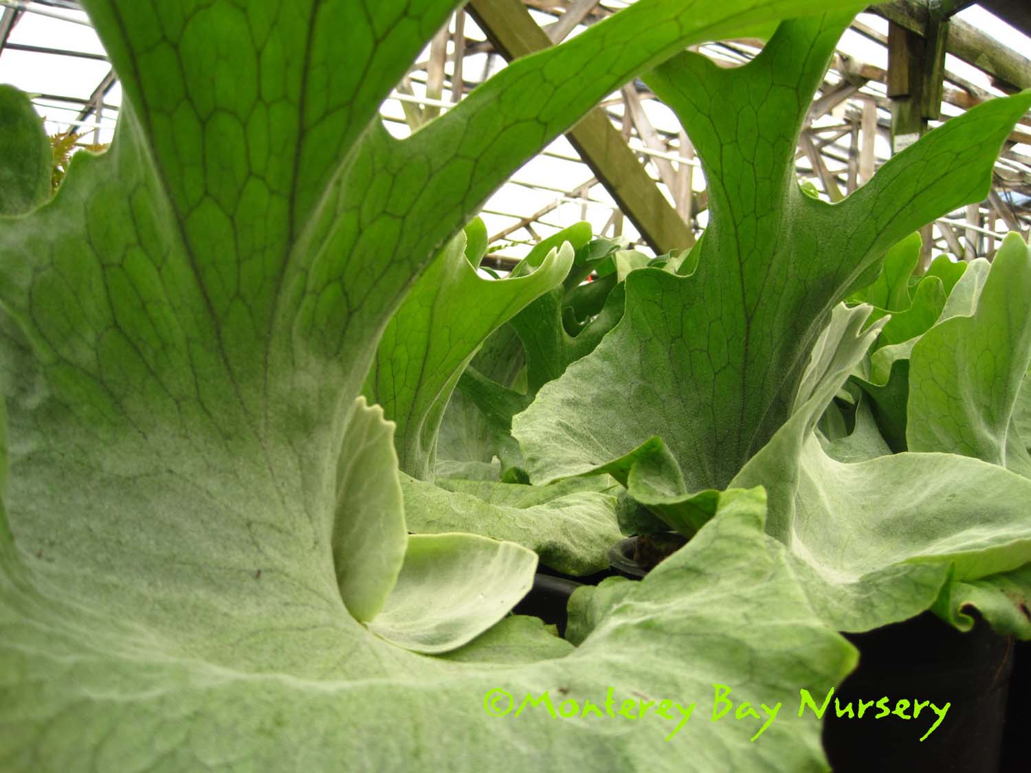 grande  LOWLAND GIANT STAGHORN FERN   happy young green pancake larvae     don't laugh - they're aliens, larval stage  a giant lowland species native to Philippines, often found growing on tree limbs. It is warmer-growing species than P. superbum, prefering higher temperatures and tolerating wetter conditions while not tolerating the dry-season or colder-night conditions enjoyed by it's Australasian cousin below. It reaches similar size (6-8' across and tall eventually, counting the hanging sterile fronds) but can be distinguished by having only one sorus per fertile (lower) lobe versus the two of P. superbum, also by having smooth new frond edges instead of ornamented. This one will stall or decline in Northern California but can be grown in the warmest, near-coastal sections of SoCal, or as a house, greenhouse or indoor/outdoor plant anywhere. Give it part shade, keep it out of really cold, wet situations and water regularly but intermittently during the warm/growing season. Like P. superbum it will not pup or offset, it must be grown from spores. USDA zone 9a (with frost protection). rev 9/2024
