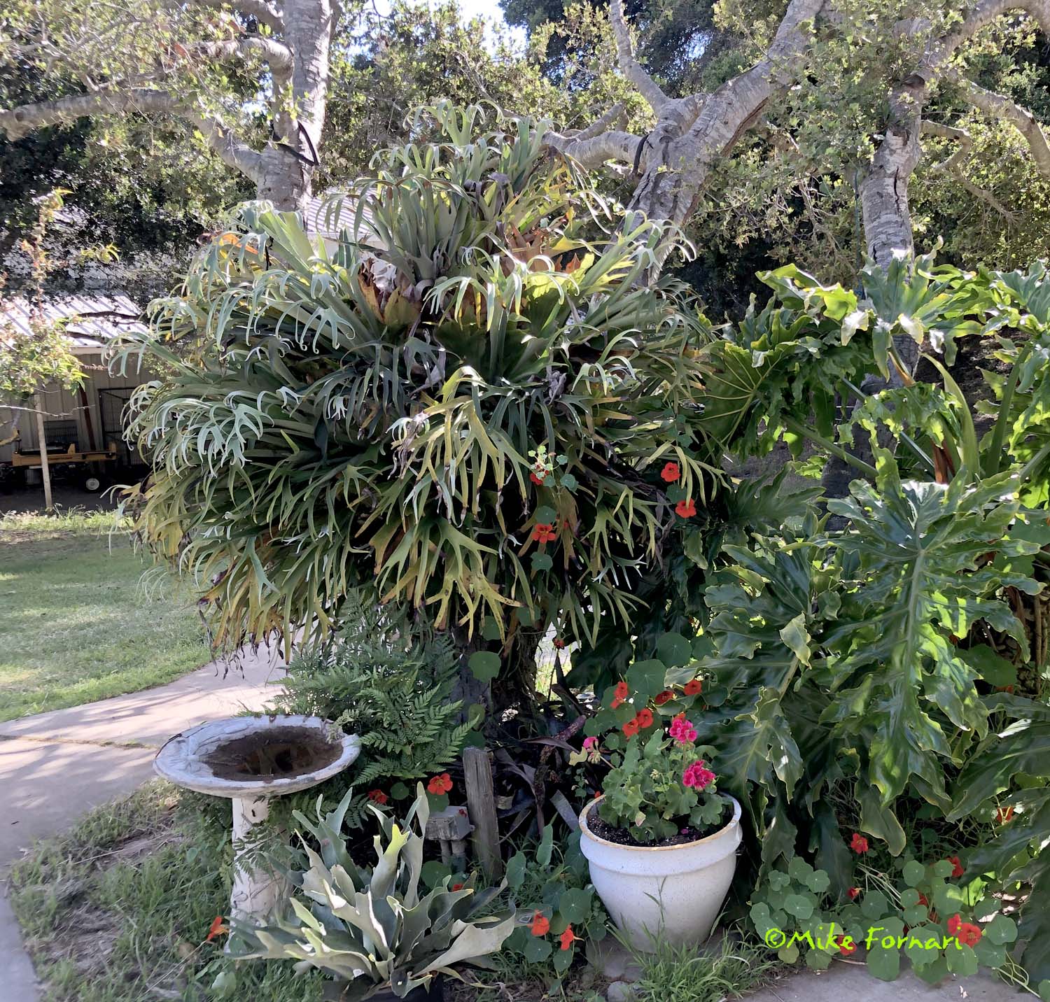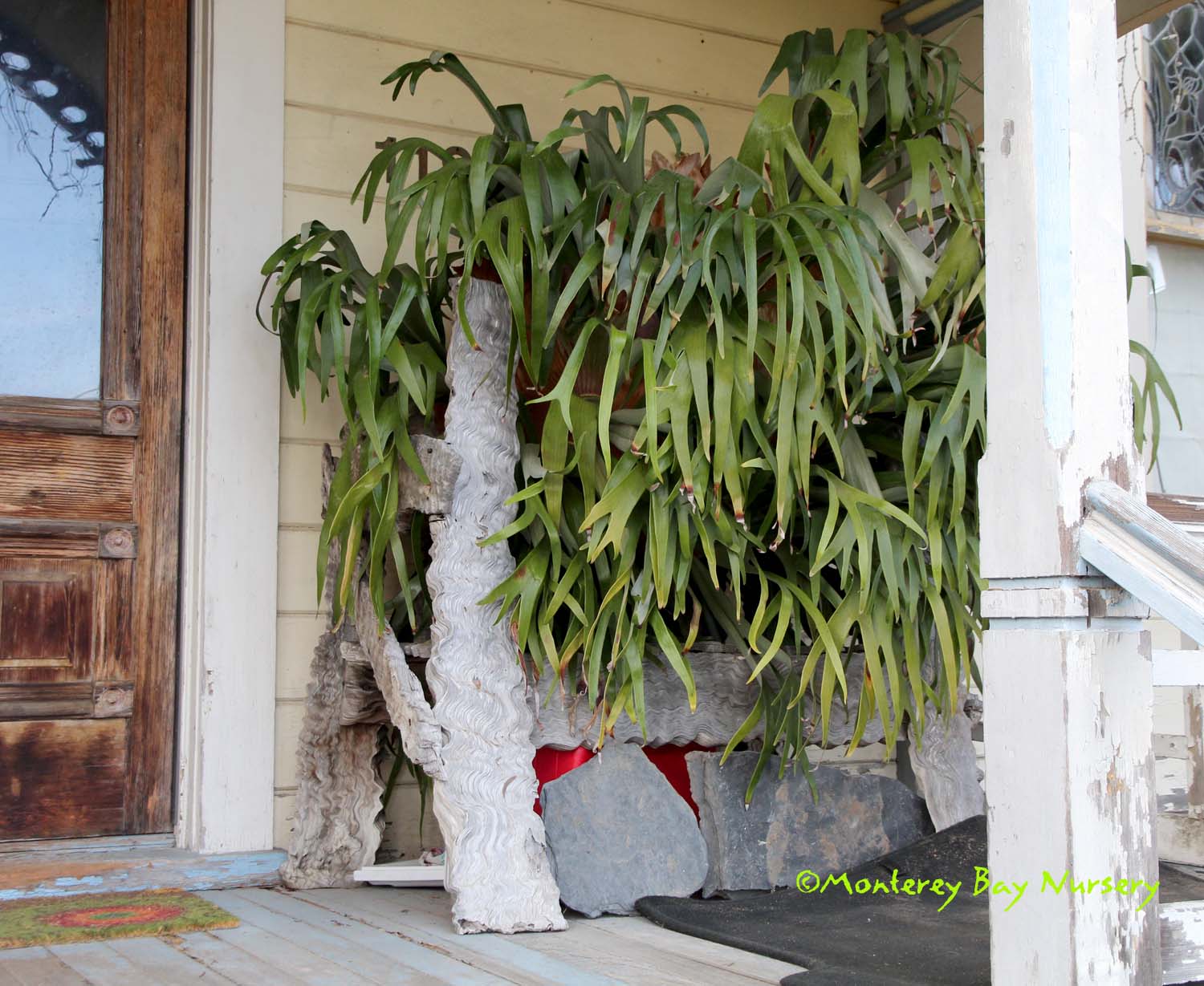 bifurcatum    Doug Brower's backyard, Eastside Santa Cruz    Richard Josephson's front porch, Eastside Santa Cruz, with wavy redwood bench     frond detail     shield detail     San Diego Zoo     Mike Fornari's yard, San Juan Bautista   the most commonly seen specimen form, this one has grey green, arching fronds which are forked twice and can easily grow up to and beyond 24" long. Mature plants can get quite large and make impressive specimens that show off your incredible plant-growing skills. Besides the usual mounted displays it also grows just fine any large container, which is how we produce them, in a mix comprise of Cymbidium-grade fir bark (1/4-1/8") mixed with a light succulent or fir bark mix, or similar orchid media. Bark or slab  mounts are easiest using a gopher basket lined with cloth or even cardboard, it only has to last until the shield-frond wraps around and engulfs it. Some direct sun to bright shade, keep moist but let dry a little, never keep it dark and wet-wet. A great plant for a partly sunny or average-shady deck if you protect it from any real hard freezes, and it can also live in your house when small. USDA zone 9/Sunset zones 15-17, 19-24. rev 5/2020