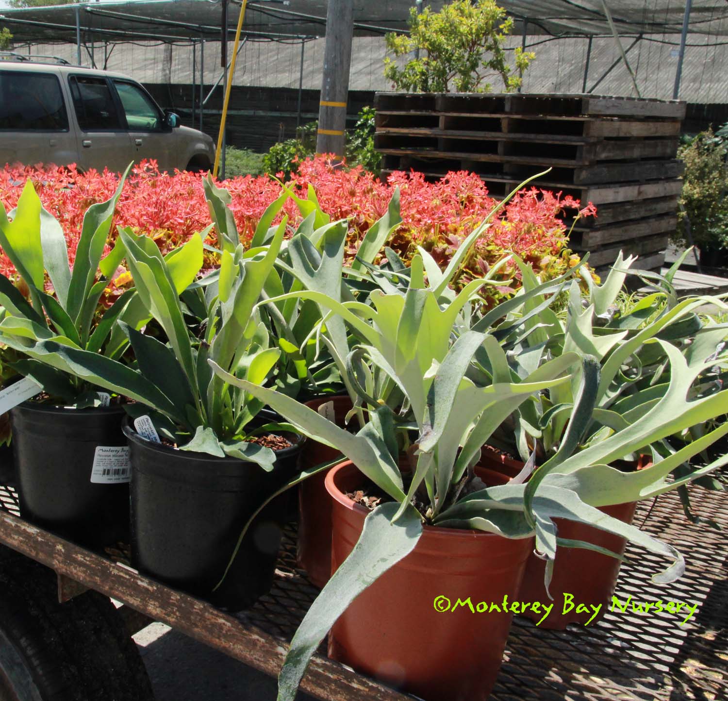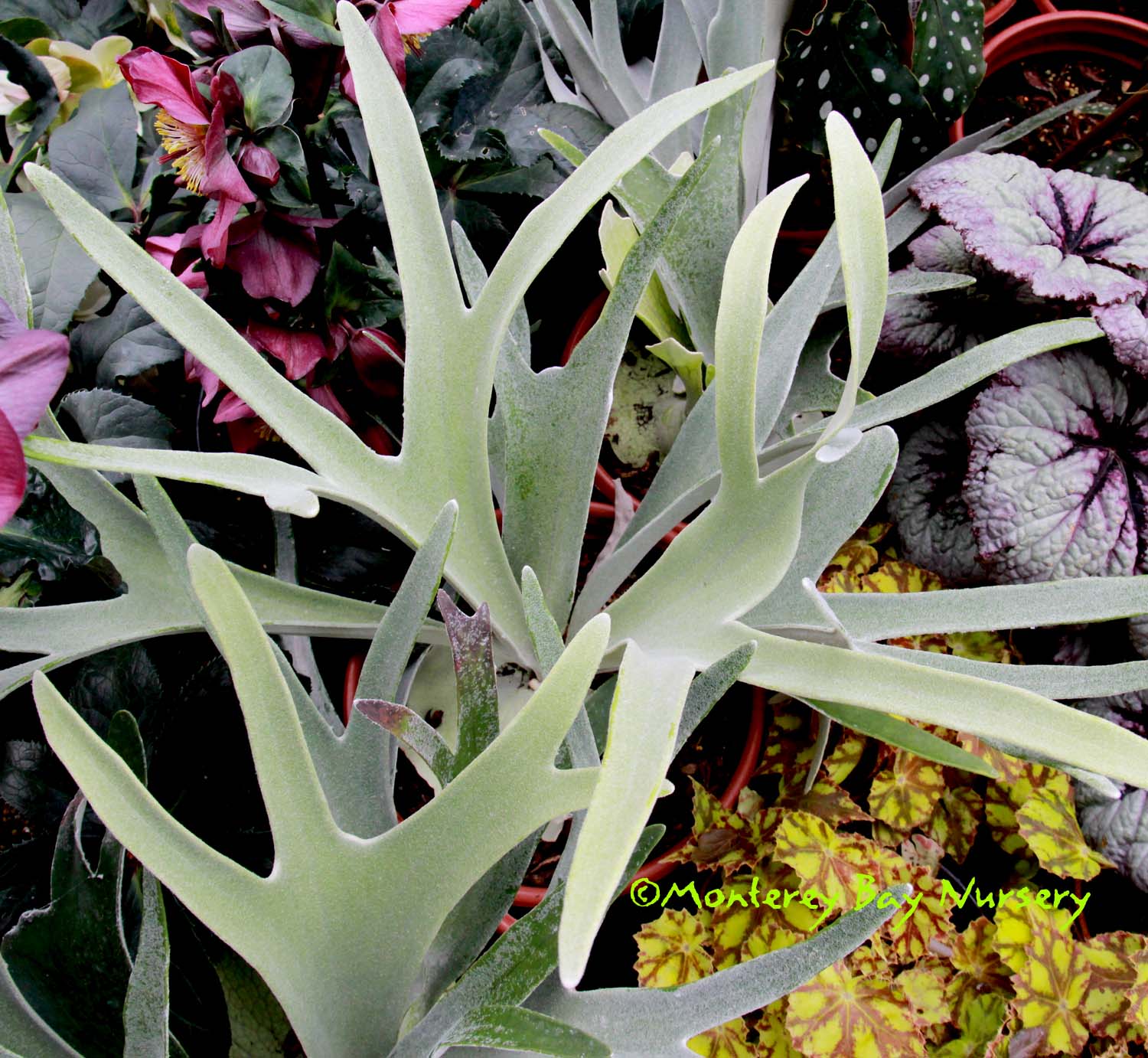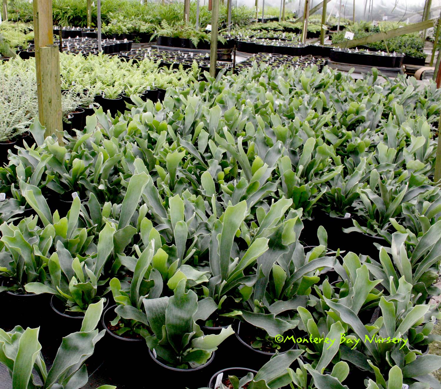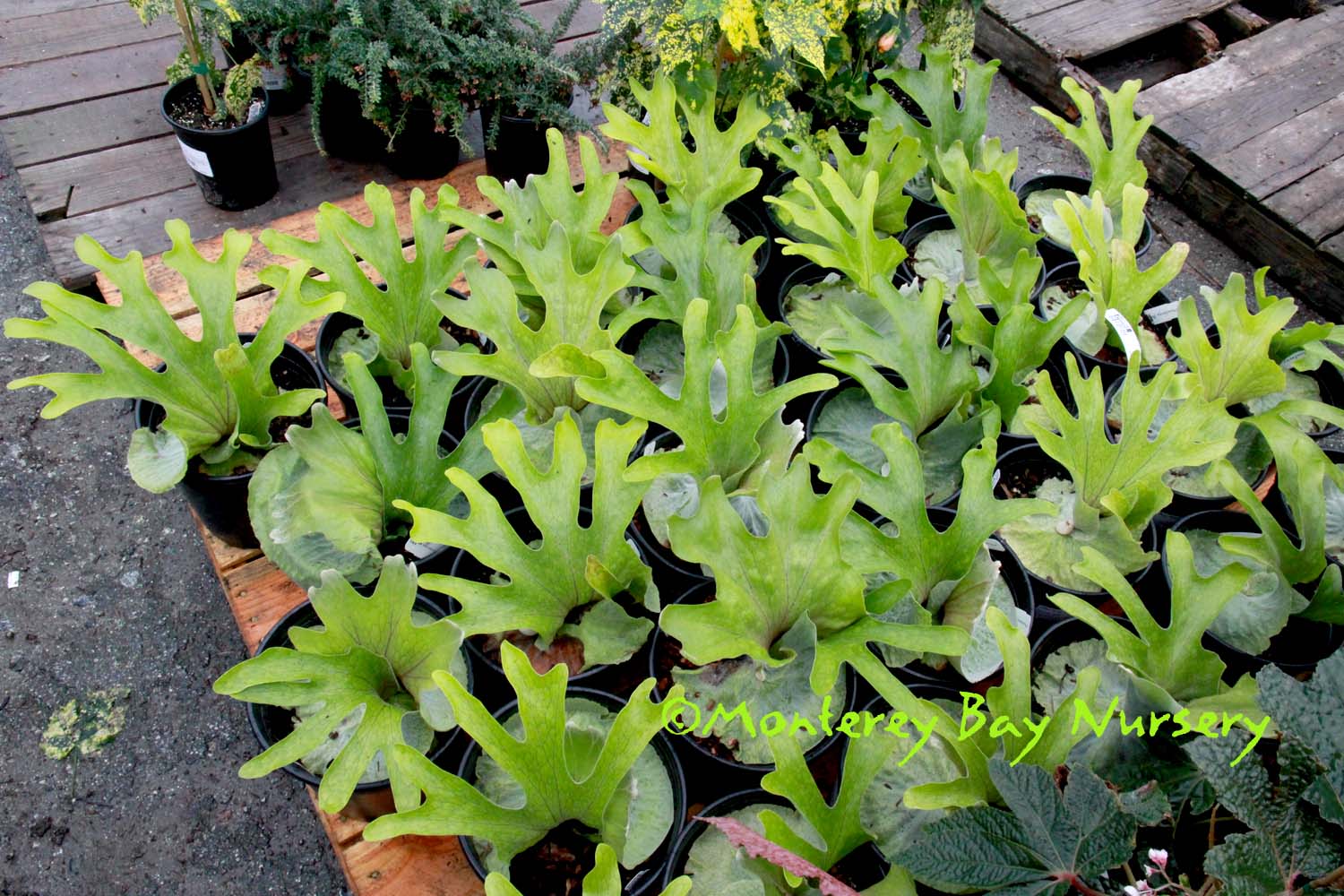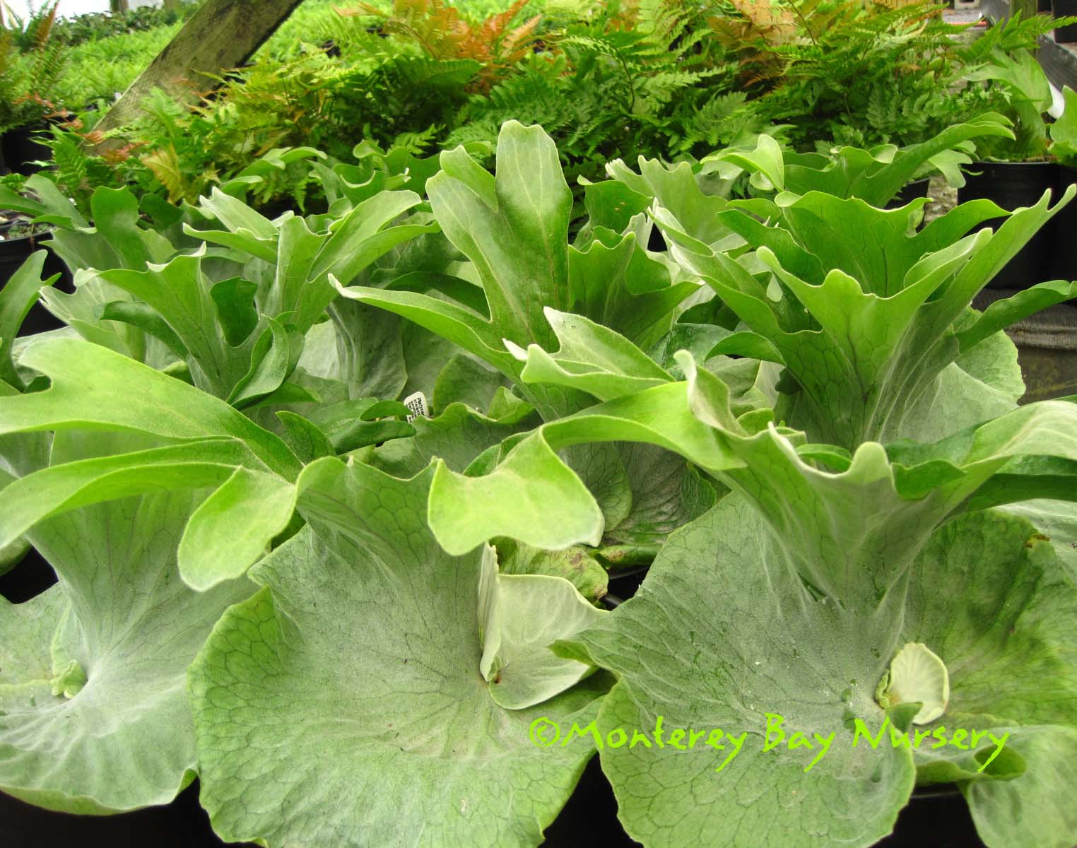 Platycerium    Pacific Plug and Liner greenhouse-pet  - brilliant!   a genus of epiphytic and lithophytic ("likes rocks," i.e. grows on rocks) ferns native to Australasia, Asia and Africa. Some make easy, impressive outdoor display specimens for coastal and near-inland valleys. We haven't found any small species yet though, expect all to get gi-normous unless you have the heart to strip out big chunks from the ever-increasing and always-eventually-massive clump. A chance visit to a local greenhouse revealed a spectacular worker-pet specimen, ~12" container, that some worker had planted up. A brilliant and most likely clueless innovation that has proved to be a fantastic production and shipping solution for us versus traditional slab-mounting. So simple, so obvious and yet so unique. And they thrive when grown that way, all of them so far for us. Polypodiaceae. rev 9/2024