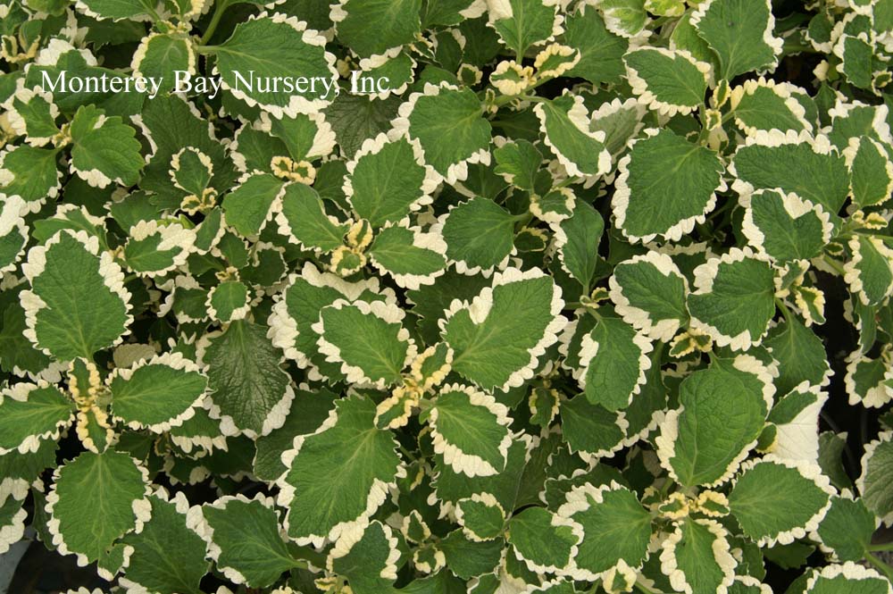 forsteri 'Marginata'  (not currently in production) clean marginal variegation  one of the best of the variegated foliage Plectranthus varieties, vigorous and not too prone to reversion. Mixes well with a wide variety of other foliage/blooming plants. Fast, easy, great in containers, mixed or as a focal point plant. Part sun to shade, average soil/watering. rev 5/2006