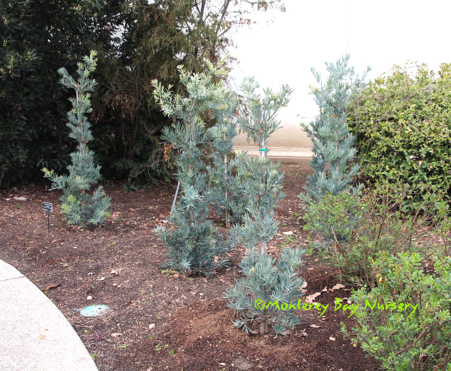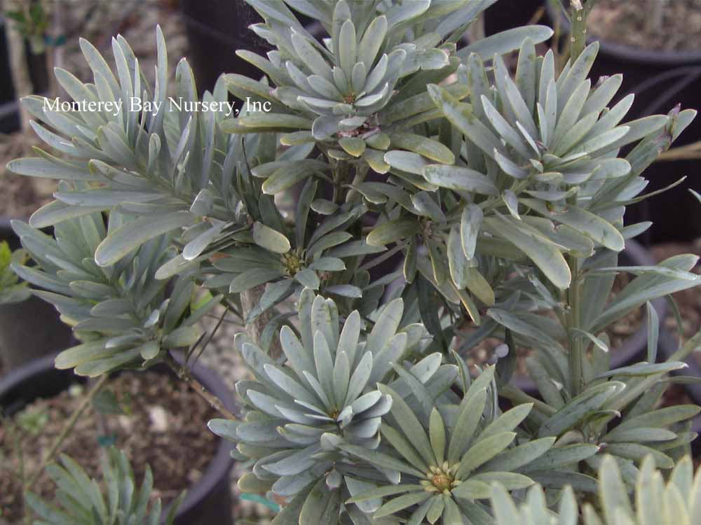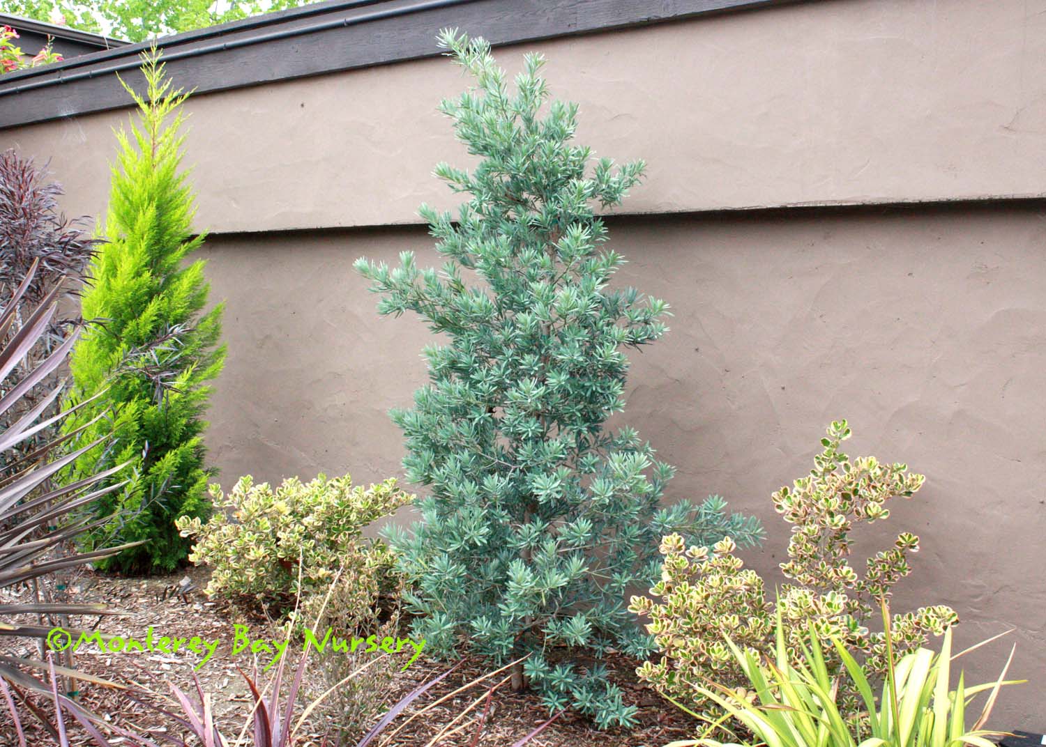 elongatus 'Blue Ice' (graft)  BLUE ICE PODOCARPUS   young wall shrub   foliage closeup     full sun, Cabrillo College front display garden      full bright shade, SF airport, lowest level 2014     future grove, Huntington Botanic Gardens, 2013    a very compact, dense, spreading shrub and eventually a small tree used for its very blue to blue grey foliage. It is a slow grower to 15-25', filling in as it goes to form a pyramidal shape. The needle color looks great against any colored background or grouped with other foliage plants of all types. Leaders on grafted plants almost always veer horizontally for a while as a reminder of their side-branch origin. Within 4 years or less (usually) new vertical leaders sprout from the main trunk and the plant will resume its usual 1' per year growth rate. This selection grows happily in full sun or full, bright shade (i.e. northern exposure only). I fully expect it would also do well in the ultimate problem site, "shade plus a long overhang," which is seen unfortunately often around commercial buildingscapes, but I haven't verified that with an example yet. Needs average to little watering based on sun exposure, temperatures and average humidity. It makes an exceptionally good container plant, large or small, and can be cut back for regrowth indefinitely. It is a very clean plant, dropping only its small needles periodically, and good for use near patios and walkways. Western Cape, South Africa. rev 8/2019