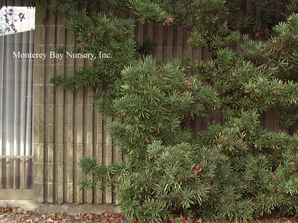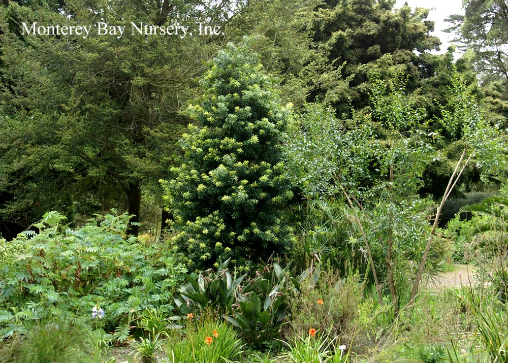 Podocarpus  about 100 or species of conifers related to yews, with similar but usually larger leaf-like needles. Many species are either fast growers and/or have wood with excellent qualities and so are harvested for timber. Others are very slow and can be found being used as dwarf conifers. Many make excellent garden or landscape plants and at least 5 species or their varieties are regularly offered in the California nursery trade, with more, especially dwarf species, available from specialty nurseries and botanic garden sales. All species are dioecious (separate male and female plants) and all parts are poisonouse except for the small, fleshy, fruit-like female cones, which can be eaten in modest quantities without ill effects. This genus had its origins in Gondwana, the Southern Hemisphere supercontinent, and is still found primarily in Africa, South America and Australia/New Zealand, but a few species are found in Southeast Asia (China, Indochina, Japan, Philippines, Pacifc Islands) and many more are native to Central America. Podocarpaceae. rev 8/2019
