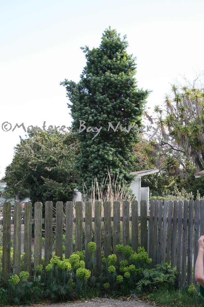 latifolius  (not currently in production) BLUE PODOCARPUS, REAL YELLOWWOOD, MOGOBAGOBA (Northern Sotho), UMSONTI (Zulu)   at Strybing Arboretum    foliage, closeup     espaliered, Strybing    big plant   this wonderful foliage plant is grown for its powdery blue, flattened needles, its compact, mostly narrow, often irregularly conical habit, and its slow growth. Like most Podocarpus its new growth is a wonderful, light bronze color and has a soft, rubbery texture. It makes a great subject for against a wall of the appropriate hue (grey, olive, red tones, etc.) or for mixing with other foliage plants (Colocasia esculenta 'Fontaneisii,' Phormium 'Maori Maiden,' Escallonia 'Golden Briant,' etc.). In nature it gets to be 100' tall but that takes quite a while and probably only under the most favorable conditions. If you get it there it will display wonderful peeling tan bark. In most situations expect it to stay under 25', and even that will take some time. To keep it happy grow it in part shade in acidic soils with moderate watering. If the needles show more yellow than blue treat the soil to acidify it, use iron treatments, fertilize with acid-forming high nitrogen fertilizers, or any combination thereof. It makes a wonderful, easily restrained container plant. Plants are dioecious, with separate male and female plants. The females bear attractive little powdery blue fruits on soft, fleshy receptacles, maturing to purple in winter. They are edible. This plant ranges throughout southern, eastern, and northern South Africa, even up in to Zimbabwe (Rhodesia), and can grow in dry, rocky, chaparral-like habitats. It is a valuable timber tree, something like Ponderosa Pine, and is the National Tree of South Africa!! Probably hardy forUSDA zone 9/Sunset 8-9, 14-17, 21-24. Podocarpaceae. rev 8/2019