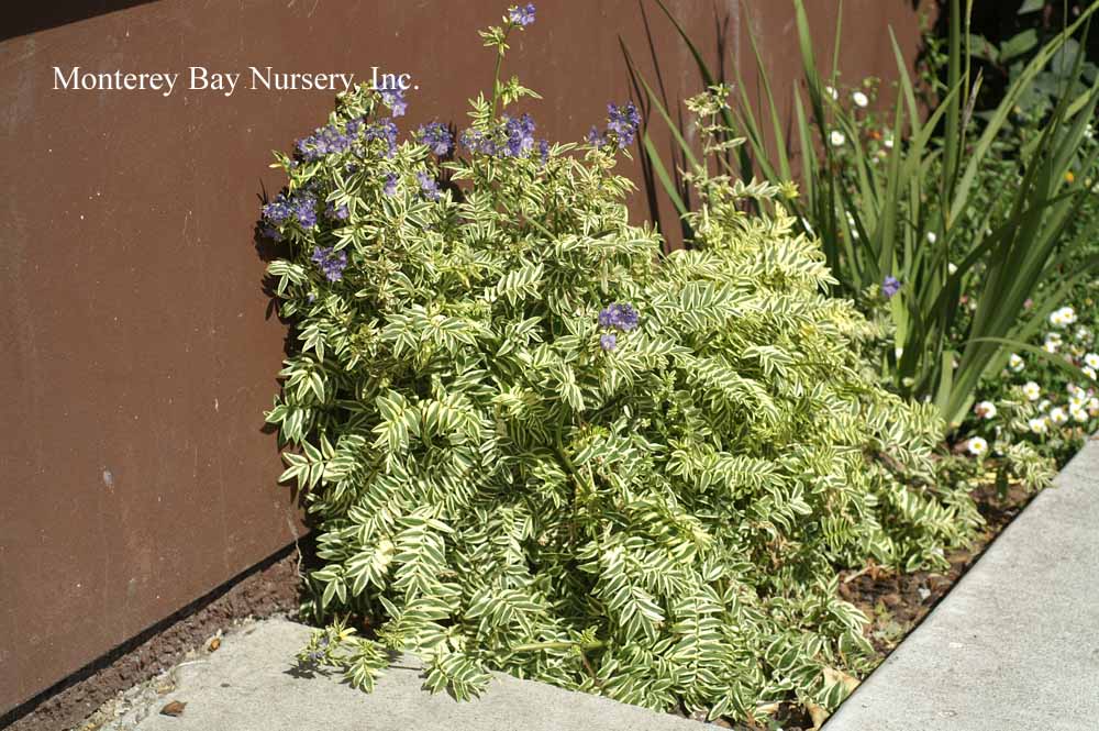 Polemonium 'Brise d'Anjou'  VARIEGATED JACOB'S LADDER  flowers   typical plant   foliage closeup   a clumping perennial with rosettes of finely cut, compoundly pinnate, dark green leaves, each one edged with white. Foliage color ranges from mostly green to about half white depending on exposure, with more variegation in higher light. A large, well displayed clump can be almost hypnotizing to look at. The light blue flowers are just slightly tinged with lavender, and when in bloom the plant can reach about 12-16" in height. It spreads slowly. This plant is best used against dark backgrounds and dark foliaged plants or in combination with other leaf/texture plants in mixed containers. Frost hardy, average watering. Either evergreen or deciduous, depending on the amount of cold. Polemoniaceae. rev 6/200