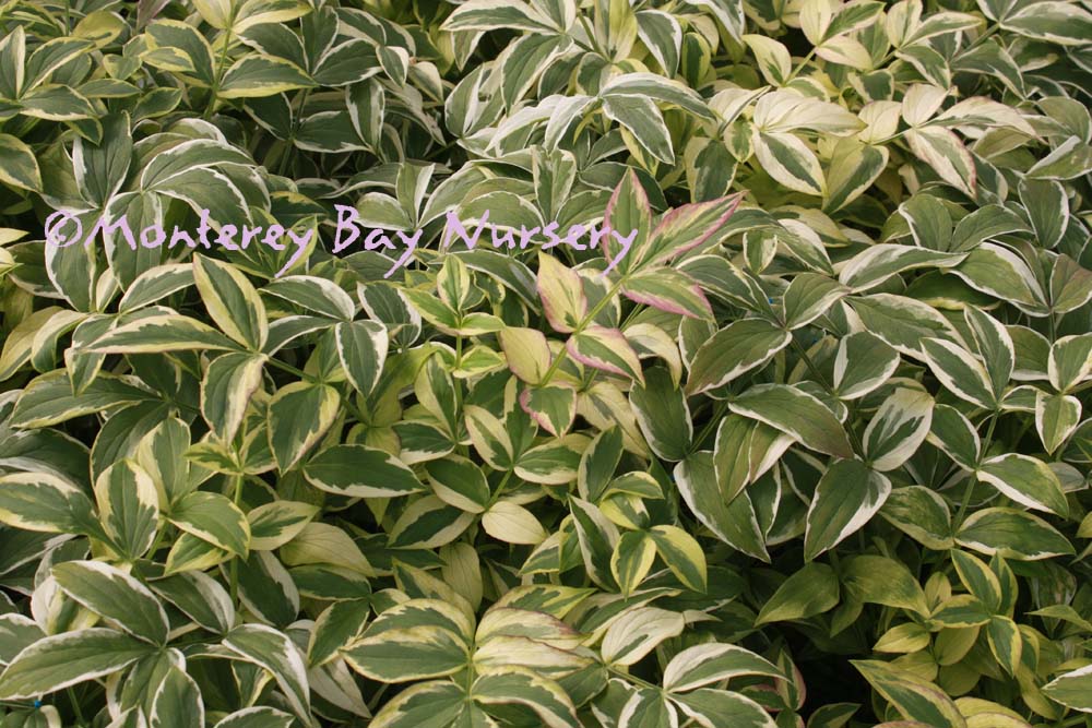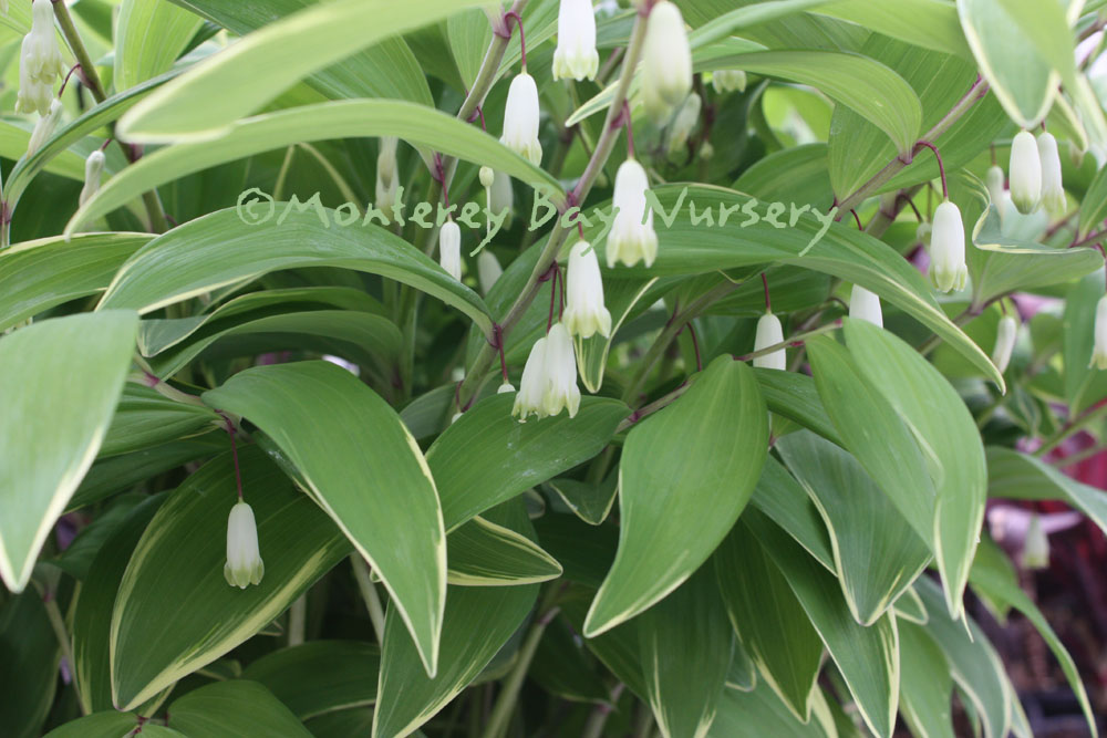 Polygonatum odoratum variegatum  VARIEGATED SOLOMON'S SEAL  bells   a deciduous, clumping perennial with graceful, arching stems of beautiful green and white leaves. In spring, rows of white, bell-shaped flowers peek from under the leaves. Foliage turns a bright yellow in fall. About 2' tall and clumping a bit more every year. It likes rich, moist soil in the shade or morning sun. Nice choice for a container on a shady patio. USDA zone 5/Sunset zones 1-9, 14-17. rev 4/2021