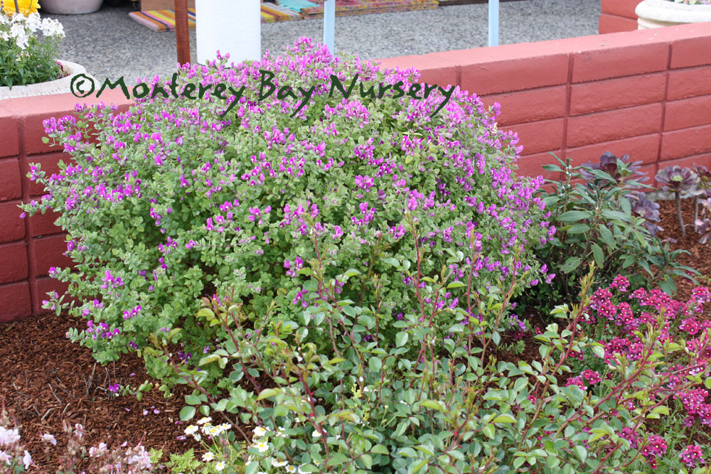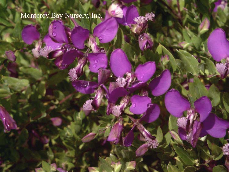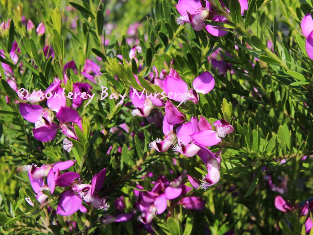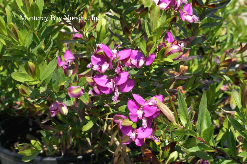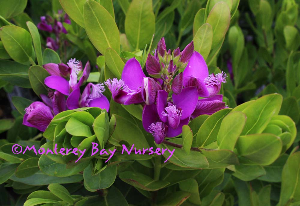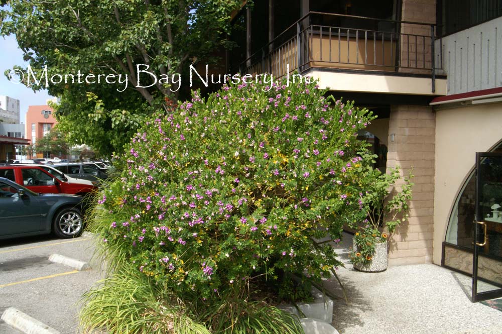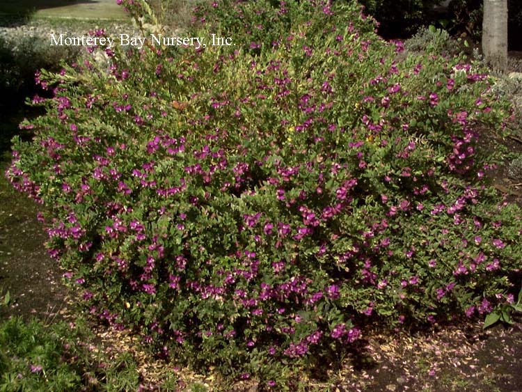 Polygala x dalmaisiana  SWEET PEA SHRUB  flowers   habit   nice planting at Sierra Azul  evergreen shrub to 3-4’ tall, with dense, spreading shape. Flowers are a medium violet purple, and are produced most of the year. Florists like the color for use in arrangements, and it lasts quite well when cut. This variety, as well as the other Polygalas we offer, looks quite good next to or mingled with the compact form Coleonema pulchrum, where the violet and light pink flowers complement each other quite well. Sun, average to little watering, hardy to around 15°F. Polygalaceae. rev 4/2006