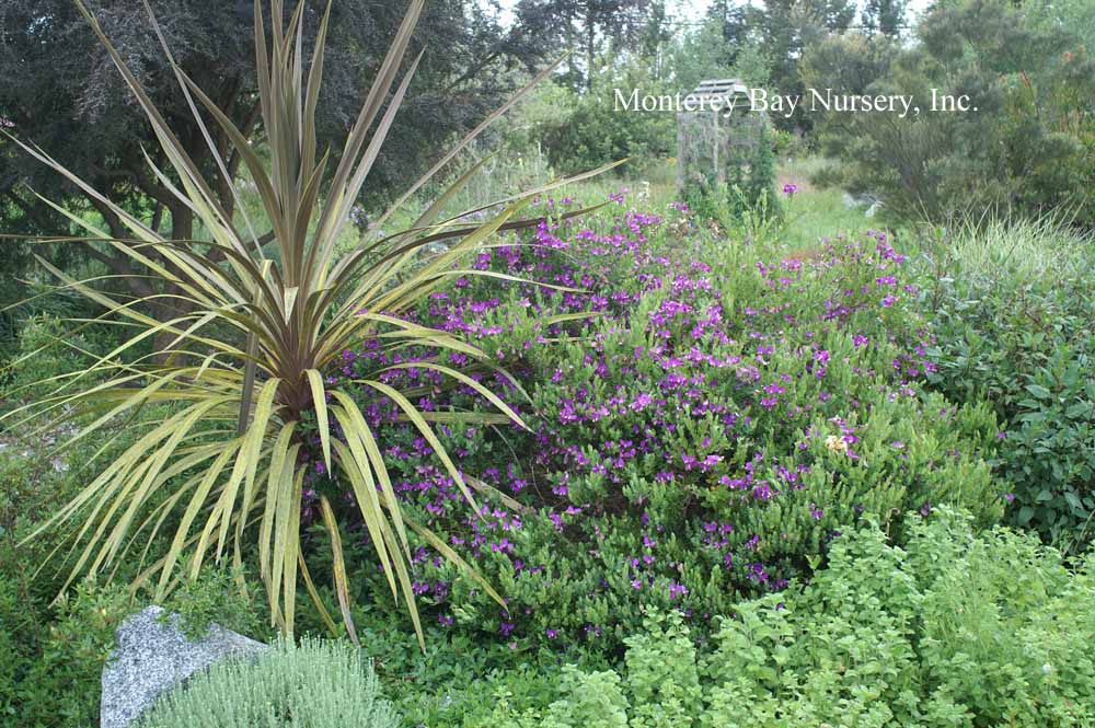 virgata  'Portola'   flowers  a compact grower with a tight habit, short leaf internodes and short flower stalks. I suspect we have Randy Baldwin's (San Marcos Growers) selection, and that it has gone 'round and 'round in the trade to become the default form just because of its superior production features and garden attributes. I've grown the "species form" of P. virgata from seed, it was quite different;  big, fast and pretty, but also open and somewhat weedy, two things this is not. Makes a nice-looking dark green shrub to about 4' tall by 4-5' across, and bears its medium deep violet purple flowers from spring through fall. Requires some but not much watering when established, and prefers the same low strength, no-phosphate fertilizers you would (very) occasionally throw on all your other South African or Australian plants. Sun, at least average drainage, hardy to below 20F. USDA zone 9/Sunset zones 8-9, 12-24. rev 1/2019