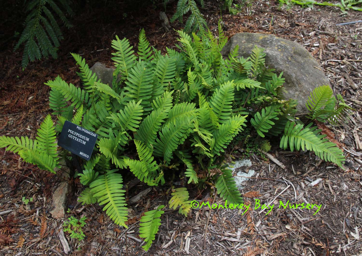guttatum  MEXICAN LICORICE FERN  happy plant at Strybing Arboretum   a low, easy, tough, slowly creeping evergreen fern for part sun to full, deep shade conditions. Usually under 12" tall but our largest plants stretch to 16" in the humid, protected greenhouse environment, with plants slowly spreading from their relatively deep rhizomes. The wide, often deep blue green fronds are held vertically with nicely regular, horizontal pinnae (leaflets) and relatively heavy, thick, substantial texture. Likes average watering but can be adapted to intermittent summer irrigation, just make sure its got moist soil somewhere down underneath those rhizomes. Part sun to full, deep shade conditions. This is a pretty and forgiving fern for container use, with its clean, dark green, leathery, durable foliage. Remove old or damaged leaves when new growth emerges, usually in late spring. It is native to the mountains and upland areas of northern and northeastern Mexico and is used there as a tea for its antidiarrheatic properties. To ~10-15F, USDA zone 8. rev 6/2020