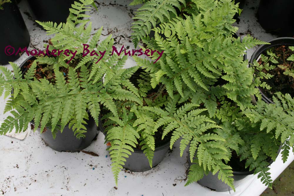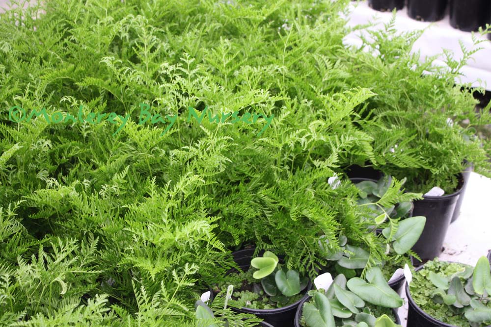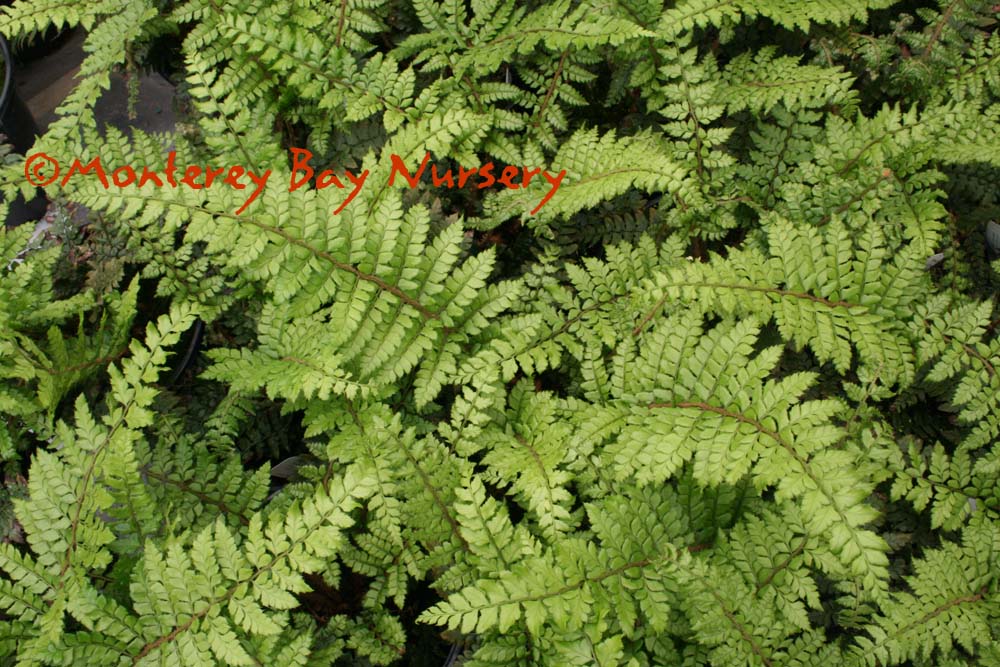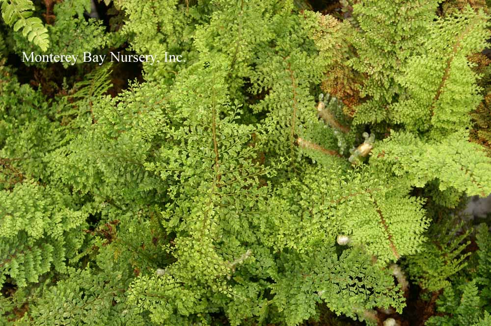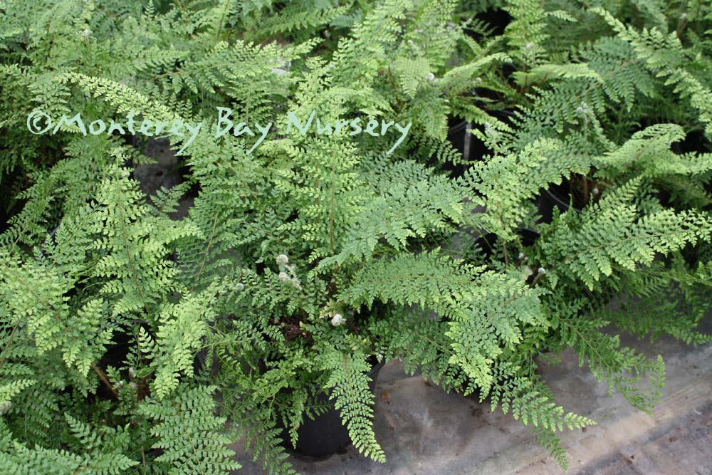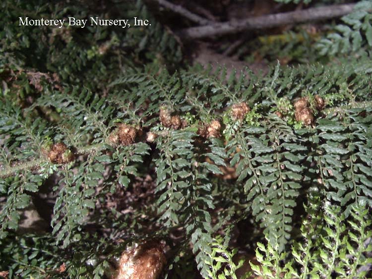 formosum  closeup of foliage   creepy caterpillars  CATERPILLAR FERN  it's soft, it's green, it's a little fuzzy and it crawls slowly. Plus it's cute. Plus the rhizomes do look like caterpillars, being soft, light green (with spots), a little fuzzy and crawling slowly. They're cute too. The fronds have a very nice texture and a somewhat herringbone pattern to the leaflets. This has grown well at Merritt College in Oakland outdoors in a protected area for a few years. It should be fine away from direct frost in gardens in the milder parts of Northern California as well as making a nice container plant, or a house plant for a cool and humid location like a bathroom. Its most common use is in a hanging basket, where you can really see those cute lil' caterpillars. Give it rich, peaty soils, a protected, shady spot, water as needed, and avoid messing with it once established. Some populations (ours? yes? no?) can take some frost, to about 25F, but it will go deciduous much below 40F anyway and begin to suffer damage to roots below freezing. Sunset zones 8-9, 14-16 (protected), 17, 21-24/USDA zone 9. Japan, Southern China, Taiwan. rev 1/2017
