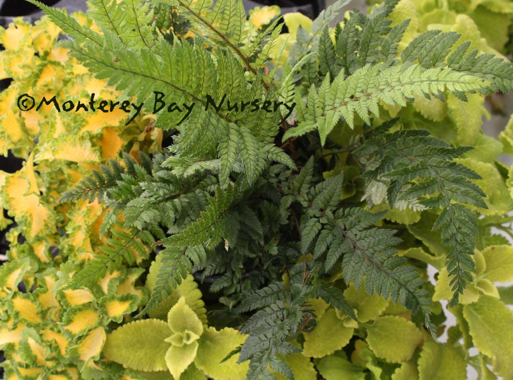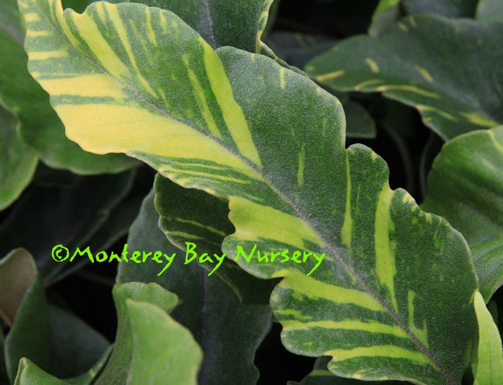 'Ogon Nishiki'   VARIEGATED FELT-LEAF FERN   landscape planting    leaf pattern    another   underside  a premium, slow-growing, creeping species, bearing deep green. upright leaves to about 12" long that are streaked and splashed irregularly with stripes and chevrons of rich golden yellow. Young leaf undersides are covered with peach or tan-colored fuzz, then mature to a more coppery, lightly iridescent indumentum. Highly ornamental, this is a choice plant choice for choice containers, dark spots or any special, featured position in your shade garden or patio. Part sun to full, deep, dark shade, rich soil but likes a loose compost on top to send its rhizomes through. Surprisingly tough and drought tolerant when established, but it will always need at least some watering, and it doesn't give you a lot of warning that it has had just about enough of this dry-garden nonsense. This variegation, like that of many similarly-marked ferns, seems to be due to a virus, and care should be taken to bleach your clippers lest you pass it around. (Although you just might like the result.)  USDA zone 7b. Eastern Asia. rev 8/2016