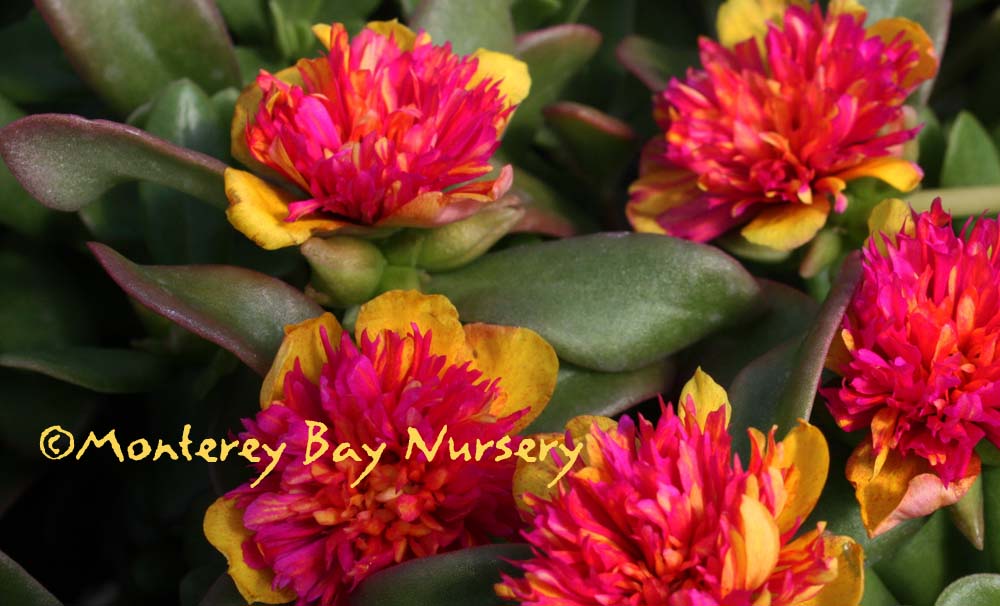 'Fairytales Cinderella'  (not currently in production)   double magenta   fluffy, dark hot pink centers and yellow petals on succulent green foliage that loves heat and won't fall apart if it doesn't get regular watering. About 4-8" tall, 14-16" wide, it can handle a hot sunny spot near gravel or a driveway. Reblooming color all season. Annual. rev 5/2014-Suzy Brooks