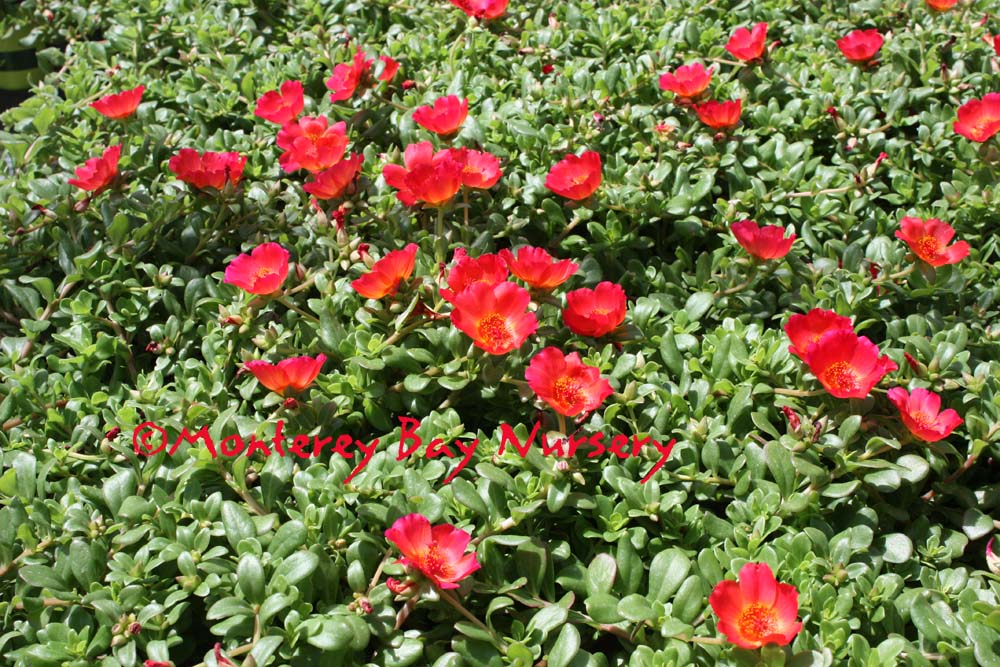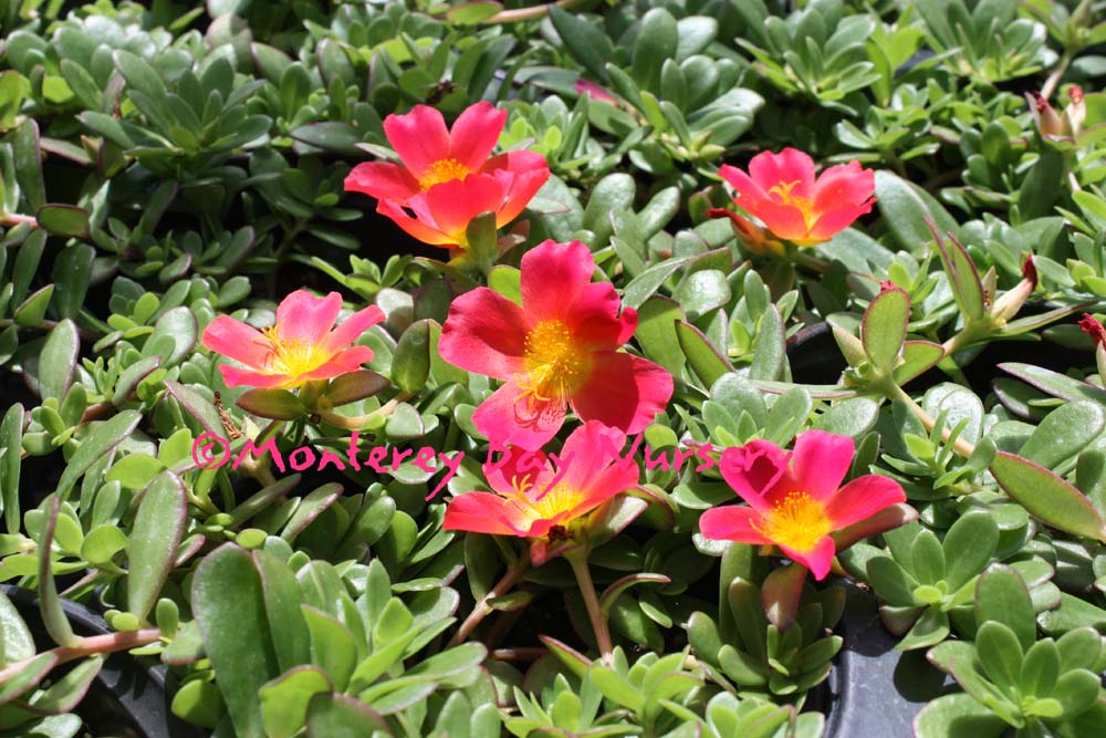 'Pazazz' series  Red Flare    Rose Glow    Tangerine   Vivid Yellow   a blast of warm season color for hot spots with a semi-trailing habit, succulent leaves and brilliantly colorful, silky little flowers, lots of them. Covers the ground or spills over the sides of pots, walls, or hanging baskets.