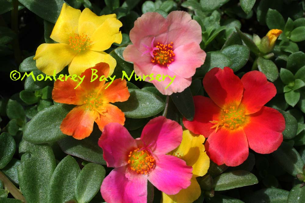 'Rio' series  MOSS ROSE (not currently in production)  all together!     these much-improved factories of strong colors factories resist deer, drought, heat, mildew, and bugs. Leaves are wide, shiny, and dark green against the very bright colors. A low maintenance color carpet for a sunny spot in baskets, garden areas needing little watering, spilling over walls, or hugging rocks. About 6" tall and spreading out quickly to 15". A worthy annual outside of USDA zone 8/Sunset zones 8, 9, 14-24. rev 5/2018