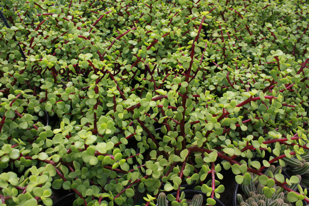 Portulacaria afra  SPIKEBOOM, ELEPHANT BUSH, PORKBUSH, MINATURE JADE  closeup  a vertical succulent shrub to 6-8' in nature, almost always seen as a small scale subject in gardens or containers here. It is characteristic of a South African biome known as "spekboom," roughly equivalent to our chapparal but subtropical, and featuring more succulent plant types such as this plant, aloes, iceplants, etc. It slowly can grow to form an upright shrub and has been used for short hedges, but that takes a long time. It really shines when kept petite enough that you can get close and appreciate the glossy green leaves against the burgundy stems. It really does look like a minature Jade Plant except it shows more stem and grows with an arching to semihorizontal habit. It was made for containers, combo or solitary specimen type, and also looks awesome against red or black lava rock in dry gardens. It makes a relatively good bonsai subject but first rate subjects are only derived from old garden plants lifted. It can grow in full to half-say sun, can take very little or very regular watering, and is frost hardy to around 25F. Sunset zones 9, 15-17, 21-24/USDA zone 9 or anywhere as a container/house plant. Portulacaceae. rev 5/2011