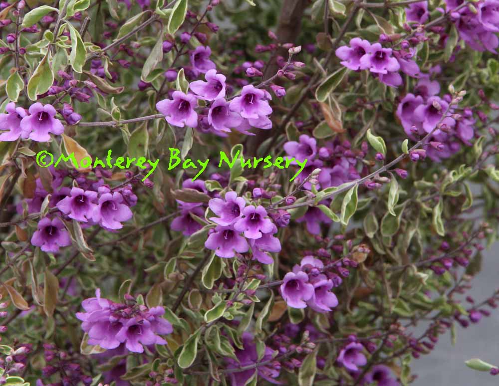 Prostanthera ovalifolia 'Variegata'     flowers   this is a moderately fast upright evergreen shrub with small variegated leaves, a somewhat open habit, and a beautiful display of violet purple flowers in a heavy show in spring. Smaller and slower than it's green parent, it is also longer lived and much easier to fit into a landscape. The leaves have a strong minty smell, hummingbirds and bees will create a cloud of activity (and therefore attention) around it, and it just needs some sun, average or better drainage and modest to very little summer watering. To about 4-5' tall, 3-4' wide, put it somewhere where you can brush against it at least once a day, by the driveway, the mailbox, or an entry.Sunset zones 14-17, 19-24. Labiatae/Lamiaceae  rev 5/2014