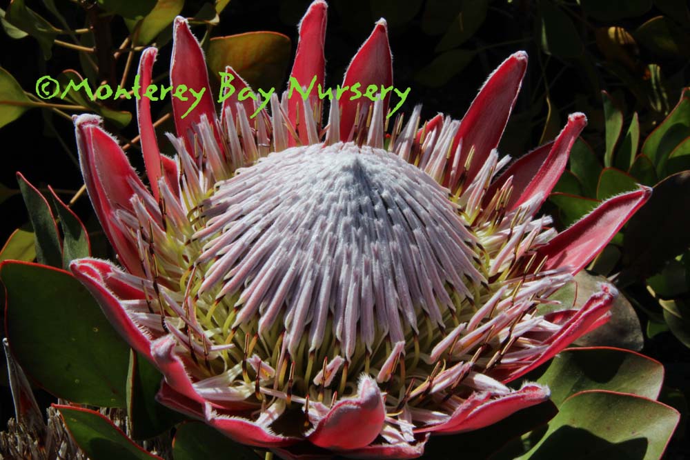 cynaroides  KING PROTEA   closeup     shrub    new growth    one of the most spectacular flowering plants on Earth, from the very California-like climate near Cape Town, South Africa. This is a famously incredible blooming shrub that is rightly respected as not the easiest plant to grow, else we would all be neck deep in it. The amazing, silvery pink artichoke-like flowers, to almost 12" across, open in late fall and late winter from the tips of recent, mature growth. The plants get about hip high by about 6' across, sometimes a little larger under the best of conditions. They rarely live over 7-10 years, and often less. It actually makes a very forgiving container plant, tolerating fluctuating moisture levels and general neglect quite well. Otherwise it needs very to be planted in quite mineral soils of at least good drainage, with little or no summer watering directly at the crown (but appreciated occasionally in the dry season where you think those root tips might be), and with a thin layer of mulch to keep the absolute soil temperature down but not retain too much winter moisture. Give it as much full, bright sun as you have, since it grows in an essentially treeless landscape, and restrict its target planting site to the Coastal Inland Valleys or places cooler. It usually needs no fertilizing when planted in almost any California soil, but might need some zero- to very-low-phosphate soluble food, at 1/3-1/2 rate, very occasionally, if in a container. Iron deficiency (dark green veins, very neatly defined) in landscape plants is easly treated by a handful of iron sulfate, plus about a tablespoon of sulfur, placed into a small hole somewhere near the drip line, and in containers is treated with soluble chelate formulas on the foliage and watered in. For best results don't try to cram this into a border, or plan on making it a core component of a permanent landscape. This plant can be unpredictable and short-lived even when well sited and grown by experts, so don't weep when it goes to that great arboretum in the sky. But remember such is the nature of growing specialty plants, they are really just another form of Neon Tetra, and when it's their time to be flushed down the toilet is about when you've decided you want some different colors in the tank. This species, like almost all proteas, makes a mind blowing cut flower but no real gardener will remove the few flowers they have spent so long growing. Does best in cooler dry-summer areas with modest or very infrequent freezes, USDA zone 9/Sunset 15-17, 21-24. rev 5/2019