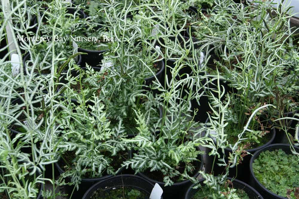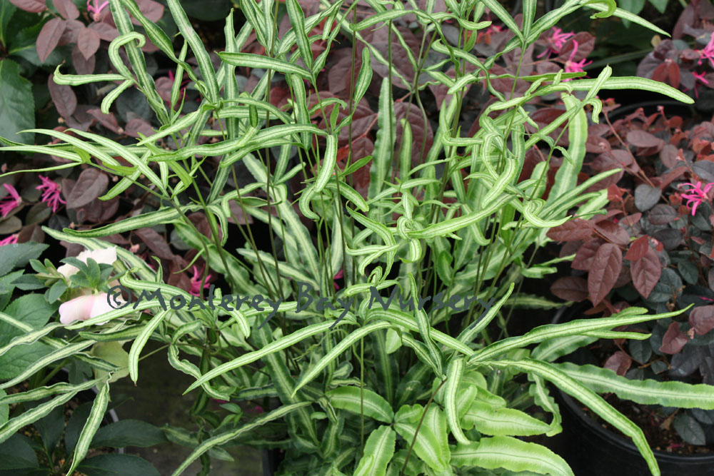 'Albolineata'  SILVER RIBBON FERN   foliage effect  an evergreen fern with a distinct, broad white band in the center of the frond, growing 18-24" tall. Really lightens up dark areas and looks dramatic against shaded or dark backgrounds. Morning sun or shade, regular watering. Easy to grow, try it in a terrarium or as a houseplant. USDA zone 9/Sunset 17, 23-24/ rev 6/2013
