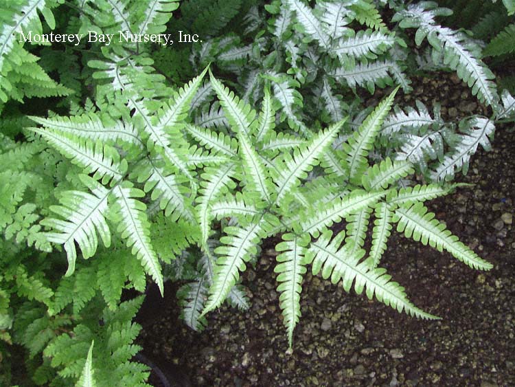 quadriaurita ‘Argyreae’  SILVERLEAF FERN, SILVER BRAKE  foliage  plant  this variety, with an almost unpronounceable name, is one of the best variegated ferns. Sometimes listed as a separate species,  P. argyreae. The broadly triangular fronds are light green, divided several times, and have a silvery white stripe down each rib, and can reach 12" long. To 30" tall. Excellent in containers, but can get respectably large in the ground. Seems hardy to around 25F. Guessing Sunset zones 9, 16-17, 21-24/USDA zone 9.Eastern Asia. rev 1/2013