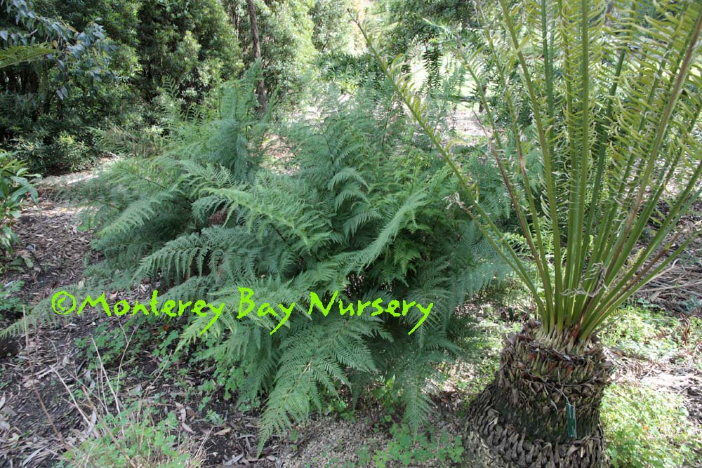 tremula  AUSTRALIAN BRAKE   pair of five-foot tall Strybing specimens   their other angle   a tall, tough, durable clumping fern to 3-6' tall and spreading to about the same across the top, with lacy, finely cut, broadly triangular bright green to dark green fronds and contrasting, almost black, wiry stems. This is a good one for dry to intermediate-wet shade, needing only infrequent watering to maintain it until winter rains but enjoying moist conditions if offered. It has enough substance to stand out dramatically in the landscape and will tolerate dark situations though at the expense of rapid growth. It fills the bill for a large, dry(er) shade landscape fern that otherwise can only be filled by our two very fine natives, Giant Chain Fern (Woodwardia fimbriata) and to a lower extent Western Sword Fern (Polystichum munitum). Its only fault is that below about 25F expect it to be possibly top-deciduous, and below 20F expect it to be possibly dead. I never had one available before to reality-show-test myself but now I'll be qualified to update that info after our next big sorry event. As far as I know only we and the late great El Modeno Nursery have ever offered this wonderful landscape fern for sale here in the US. USDA zone 9/Sunset zones 15-17, 21-24. Australia (including what must be the most cold-hardy race in Tasmania), New Zealand, Fiji. rev 3/2019