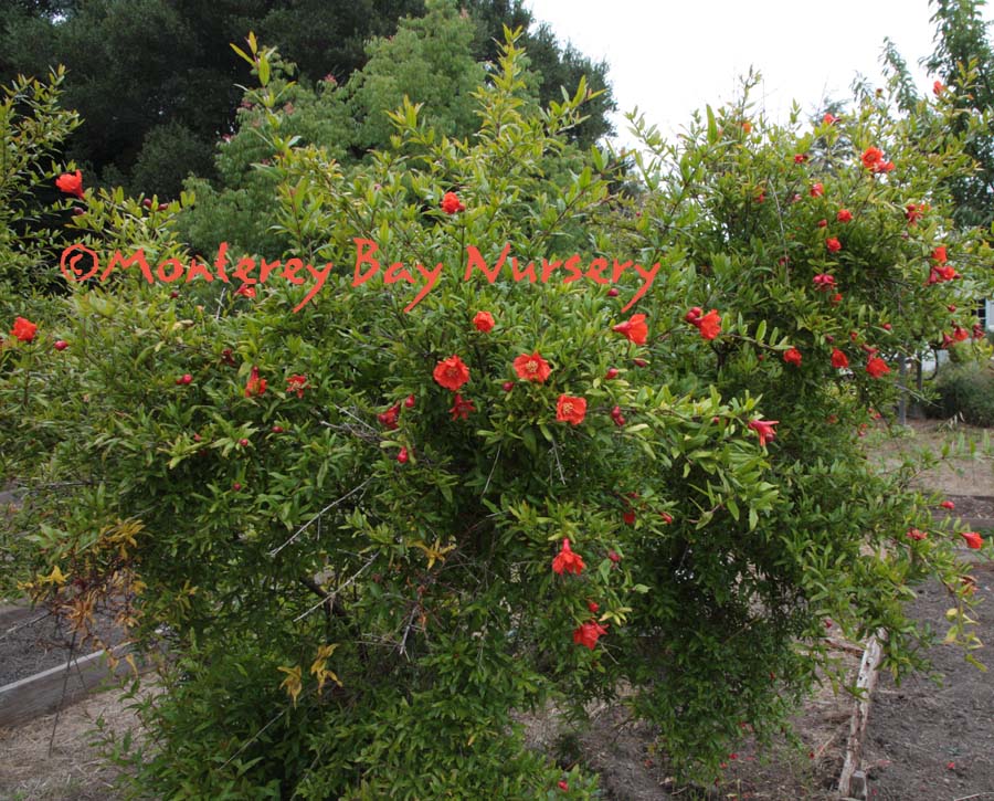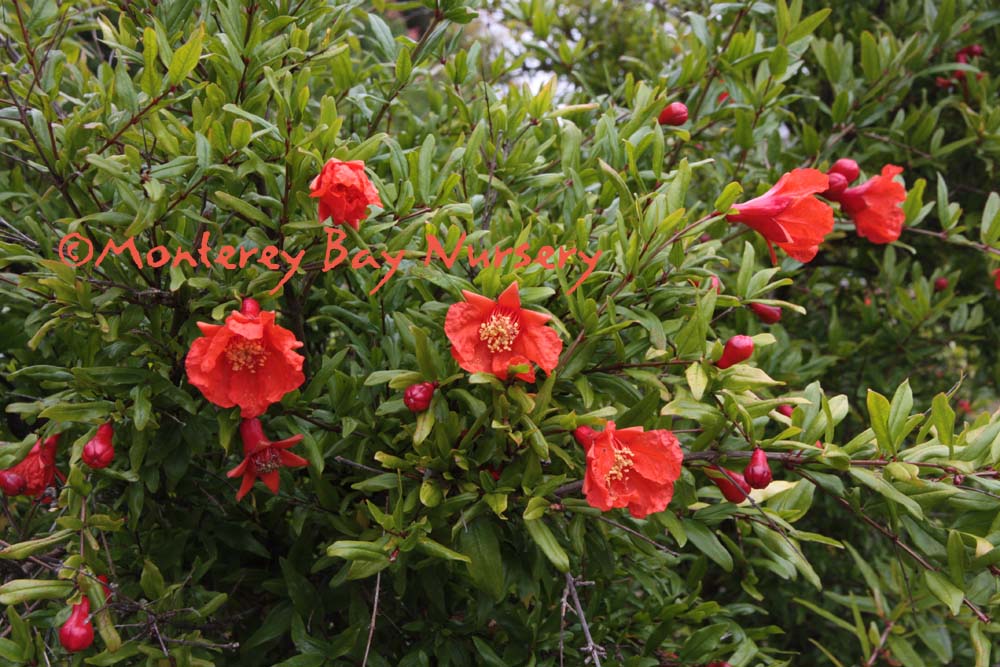 Punica granatum 'Wonderful'  POMEGRANATE   flowers    small shrub    this edible ornamental has been around for a long time! It's been an inspiration for art and design, a symbol of hope, abundance, and prosperity, and thought to be the real 'apple' in the Garden of Eden. Plus apparently it is the Fountain of Youth as far as beneficial ingredients in the juice. Easy to grow, disease resistant, few pests, just needs heat and some water. Used as a shrub or small tree, it grow to 12-20' tall and wide, though it is easily pruned smaller, and also makes an excellent screen or hedge. For fruit in the colder Sunset zones 5, 6, and 17, site it against a warm wall to capture heat. Sunset zones 8, 9,14-24/USDA 8. rev 8/2011-Suzy Brooks
